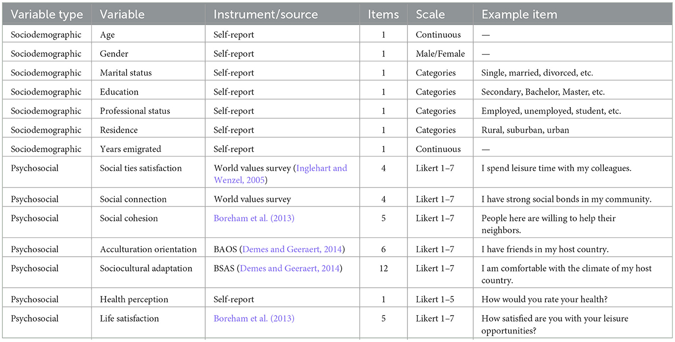 The sociodemographic variables considered included age, gender and marital status (single, cohabiting, married, widowed or divorced) of the participants. Their educational qualifications (from primary to higher education) and professional status (student, employed, unemployed, inactive, retired) were also considered. Finally, participants were also asked to identify their host country and length of residence, as well as the rural, suburban or urban context in which they live.
