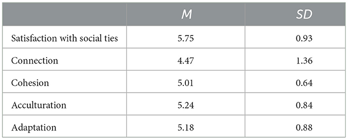 Beginning with health, which is perceived as cross-cutting and impacting various dimensions, such as satisfaction with social ties, sense of connection, cohesion and adaptation. We highlight the integrated view of perceived health (essential to well-being), in line with more systemic perspectives (Cooke et al., 2016; Keyes and Ryff, 1998; Keyes and Shapiro, 2004; Zhang et al., 2024). In this context, health, usually seen as tied to social integration (Larson, 1993), is again a key part of migration, since people in better health tend to have stronger social ties, community cohesion, and the ability to adapt.
