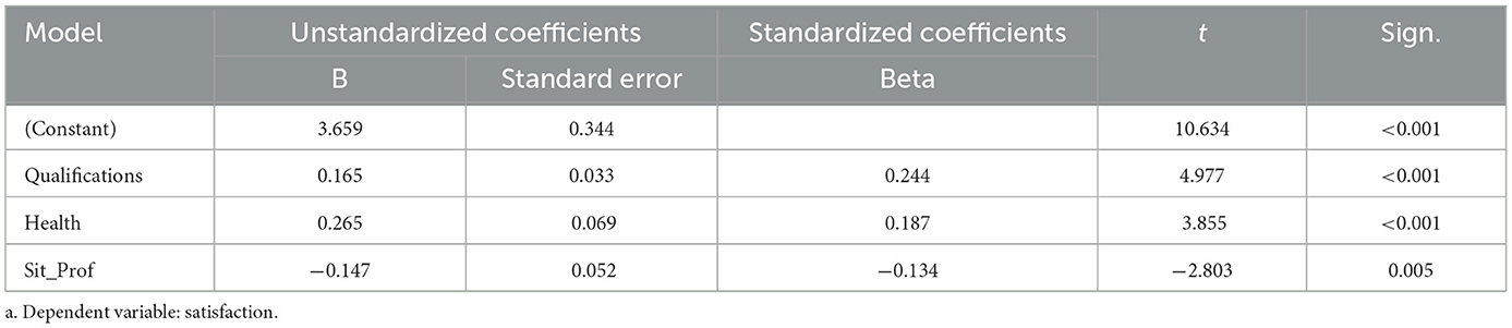 The regression model with these three independent variables (qualifications, health, professional situation and region) was found globally adequate (F = 21.556, p < 0.001), explaining 13,8% of the variance. Qualifications and health both positively influenced satisfaction (β1 = 0.165 and β4 = 0.265). Professional status, on the other hand, although significant (p < 0.05), negatively influenced satisfaction (β3 = −0.147). In summary, more qualifications and better health lead to greater satisfaction; however, better professional status tends to decrease satisfaction. Given that the variance explained by the models ranges only between 4–14%, the results should be seen as exploratory rather than confirmatory.