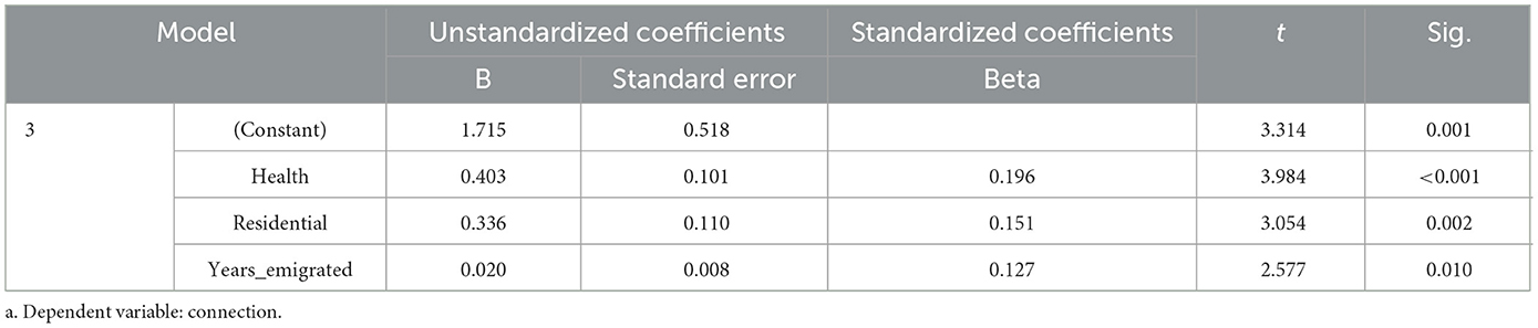 The regression model, with the three selected independent variables, is globally an adequate model (F = 10.342, p < 0.001), explaining 6.8 % of the variance. Health (β1 = 0.403), residence (β2 = 0.336) and years as an emigrant (β3 = 0.020) positively influence connection. In summary, better health, more years as an emigrant, and residing in suburban and urban areas lead to greater connection.