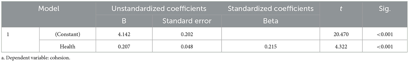 The regression model proved to be acceptable (F = 18.680, p < 0.001), explaining 4.4 % of the variance. Health was found positively influencing cohesion (β = 0.207, p < 0.001), showing that the better the health, the greater the cohesion.