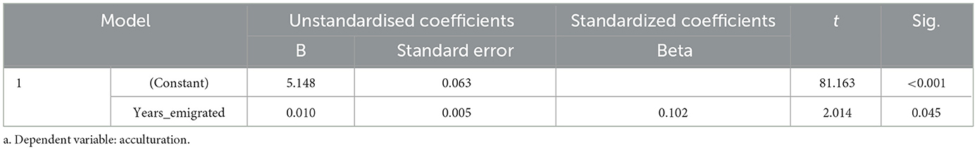 The regression model with the number of years emigrated to explain acculturation was acceptable (F = 4.057, p < 0.05). We found that the number of years emigrated directly influences acculturation (β = 0.01), albeit with a very small weight.