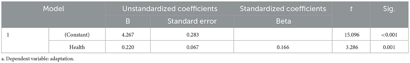 The regression model using health to explain adaptation proved to be globally acceptable (F = 10.799, p < 0.001). The relationship between health and adaptation is direct (β = 0.220, p < 0.05).
