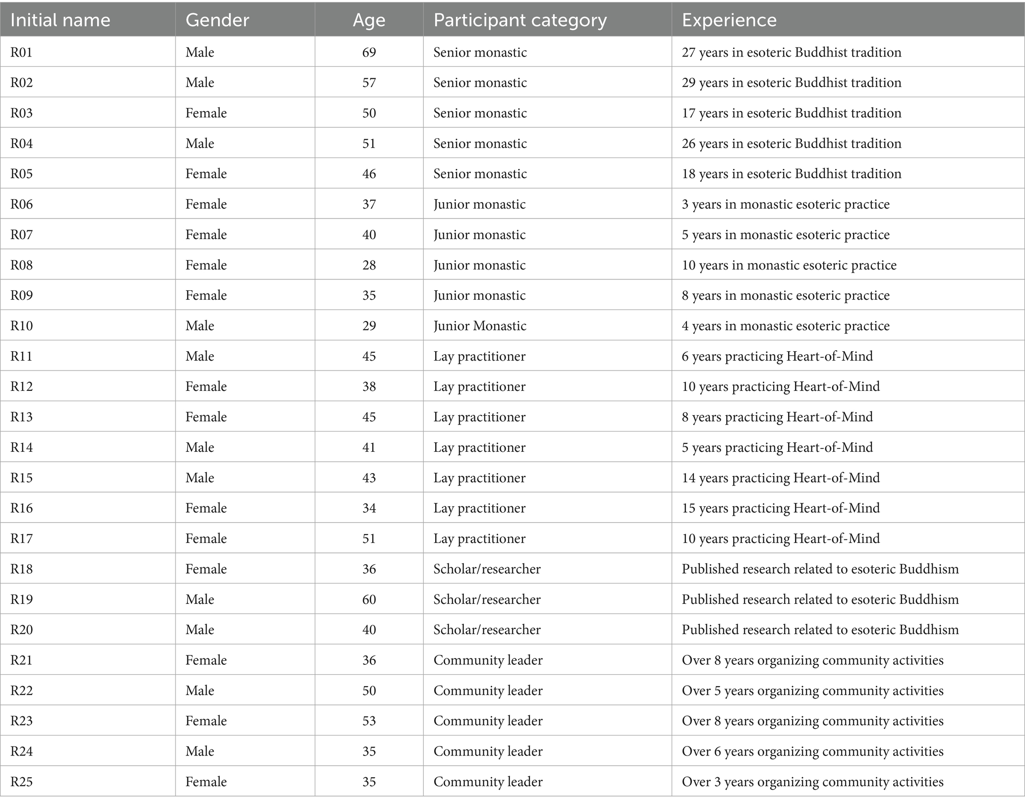 A total of 25 informants (see Table 1) were interviewed face-to-face using a semi-structured interview format. The sample comprised seven senior monks, six ritual teachers (fashi), eight lay community coordinators, and four local scholars engaged in research on contemporary Buddhism. Informants were selected through theoretical sampling, aimed at capturing participants who play pivotal roles in the interpretation, preservation, and negotiation of legitimacy within the Heart-of-Mind (Xinfa) Esoteric Buddhist network. This sampling logic followed the principle of maximum variation, ensuring representation across different hierarchical positions and ritual functions to reflect the structural diversity of the Xinfa Tantra community. The final sample size of 25 was deemed sufficient to achieve data saturation, as no substantially new themes emerged after the 23rd interview.