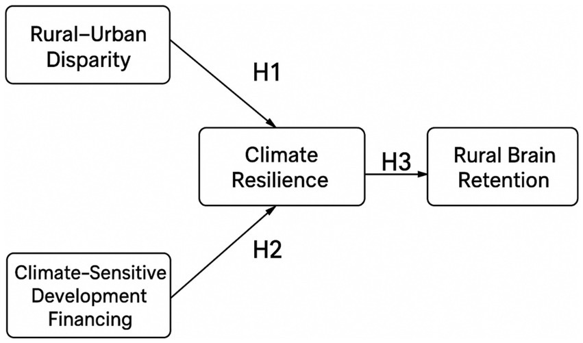 This study proposes a conceptual model that seeks to investigate the complex interrelationships among rural–urban disparities, climate-sensitive development financing, and rural brain drain, with a particular focus on the mediating role of climate resilience. The model is designed to capture how structural inequalities and financing mechanisms aimed at climate adaptation and mitigation can influence community resilience and, in turn, affect the decision of skilled individuals to remain in or leave rural areas.