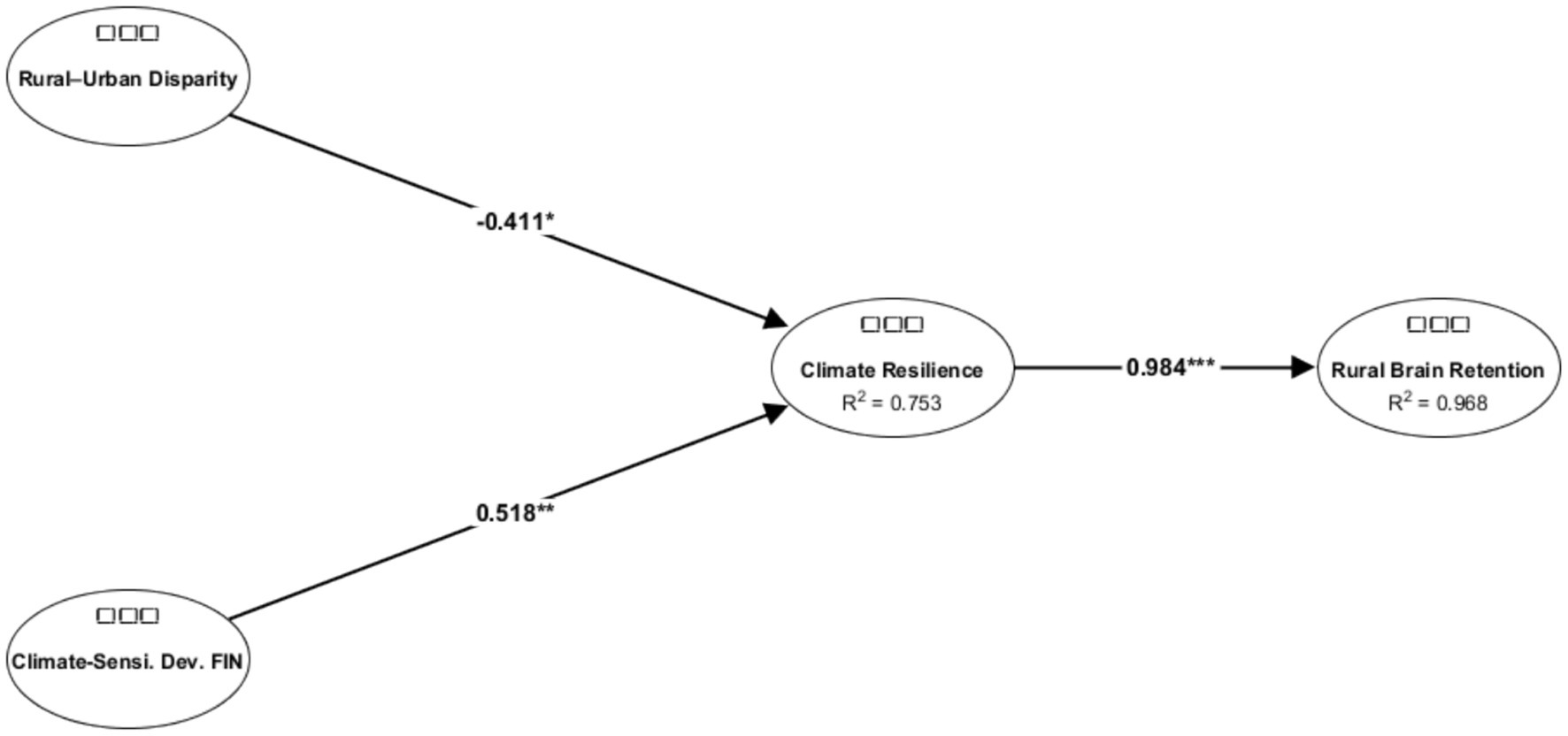 This study adopts structural equation modeling (SEM) as the primary analytical technique to examine the complex interrelationships among climate finance, rural–urban disparities, rural brain drain, and the mediating role of climate resilience. SEM is particularly appropriate for this investigation because it allows for the simultaneous estimation of multiple relationships among both observed variables and latent constructs, offering a level of analytical depth that traditional multiple regression techniques cannot achieve. Its flexibility enables the modeling of direct, indirect, and total effects within a unified theoretical framework, making it ideally suited to capture the intricate interdependencies outlined in the study’s conceptual model.