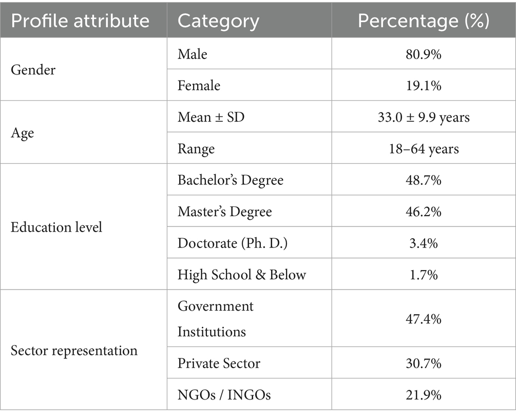 Out of the 200 questionnaires distributed, 118 valid responses were retained after rigorous data cleaning and validation procedures. Incomplete or inconsistent responses were excluded to uphold data quality standards and maintain the integrity of the final dataset. The resulting response rate of approximately 59% is considered satisfactory for studies conducted in fragile and climate-vulnerable contexts and meets the recommended sample size thresholds for SEM, which require at least 5–10 responses per estimated parameter (Hair et al., 2022).