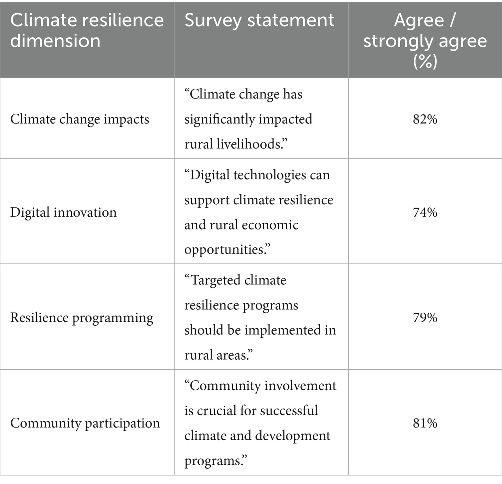 The survey findings reveal a strong consensus among stakeholders regarding the significant impacts of climate change on rural livelihoods in Somalia and the urgent need for resilience strategies. A vast majority (82%) of respondents agree or strongly agree that climate change has reduced agricultural productivity, worsened resource scarcity, and increased rural vulnerabilities. Additionally, 74% believe that digital innovations—such as mobile-based early warning systems, digital market platforms, and climate-smart advisory tools—can play a transformative role in enhancing rural resilience and opening new economic opportunities. Similarly, 79% of participants support the scaling up of targeted climate resilience programs in rural areas, citing the success of small-scale pilot initiatives in Southwest State. Importantly, 81% emphasize that community participation is critical for the design, implementation, and long-term success of climate and development interventions. These findings highlight a readiness among stakeholders to integrate innovative solutions with community-driven approaches, positioning Somalia’s rural systems for a more climate-resilient future (Table 2).
