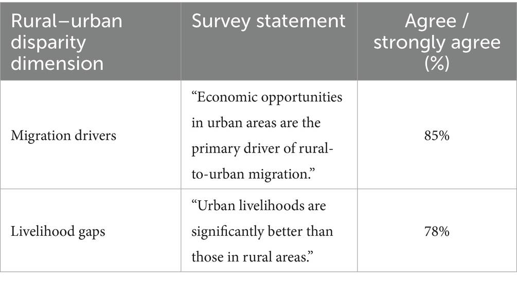 The survey findings highlight pronounced socio-economic disparities between rural and urban areas in Somalia, driving persistent migration flows. An overwhelming 85% of respondents agree or strongly agree that the search for better economic opportunities in urban centers is the primary driver of rural-to-urban migration. Furthermore, 78% strongly believe that urban areas provide significantly better livelihoods compared to rural contexts, with enhanced access to infrastructure, healthcare, education, and income-generating opportunities. These perceptions underscore the unequal distribution of resources and development investments, which continues to widen the economic gap between Somalia’s rural and urban populations. The findings suggest that without targeted rural development policies, the pressure on urban centers will continue to grow, exacerbating challenges related to housing, employment, and service delivery while deepening rural marginalization (Table 3).