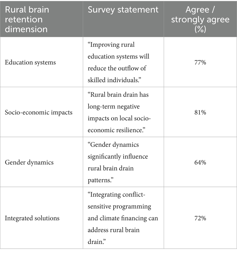 The survey findings underscore growing concerns over rural brain drain in Somalia and its long-term socio-economic consequences. A significant 77% of respondents agree or strongly agree that improving rural education systems is critical to reducing the outflow of skilled individuals to urban centers and abroad. Moreover, 81% believe that the continued loss of skilled labor has long-term negative impacts on the socio-economic fabric of rural communities, weakening local resilience and economic sustainability. Importantly, 64% of stakeholders highlight that gender dynamics play a critical role in shaping rural brain drain patterns, with women facing systemic barriers to accessing education, leadership roles, and climate-related opportunities. Additionally, 72% support the integration of conflict-sensitive programming and climate financing under a Triple Nexus approach—combining humanitarian, development, and peacebuilding strategies—to effectively address rural brain drain and foster local talent retention. Collectively, the findings emphasize the need for targeted investments in education, inclusive governance, and integrated financing mechanisms to retain skilled labor and strengthen rural development capacity (Table 4).