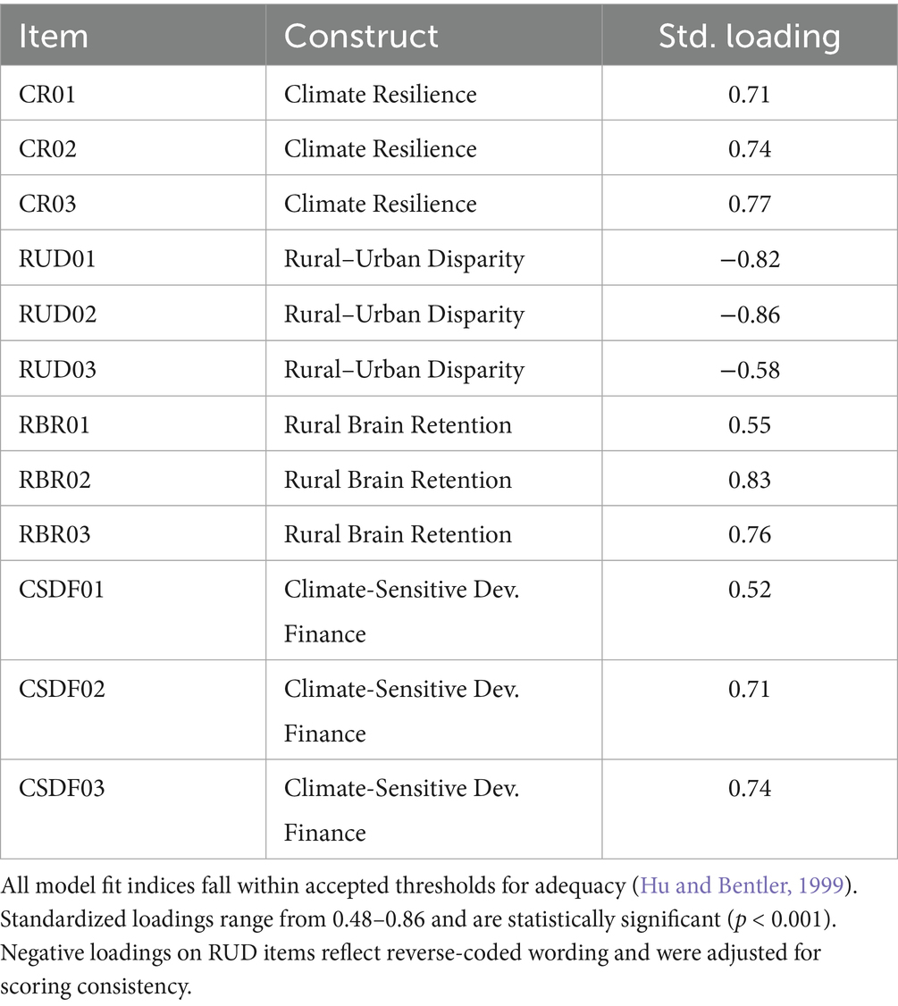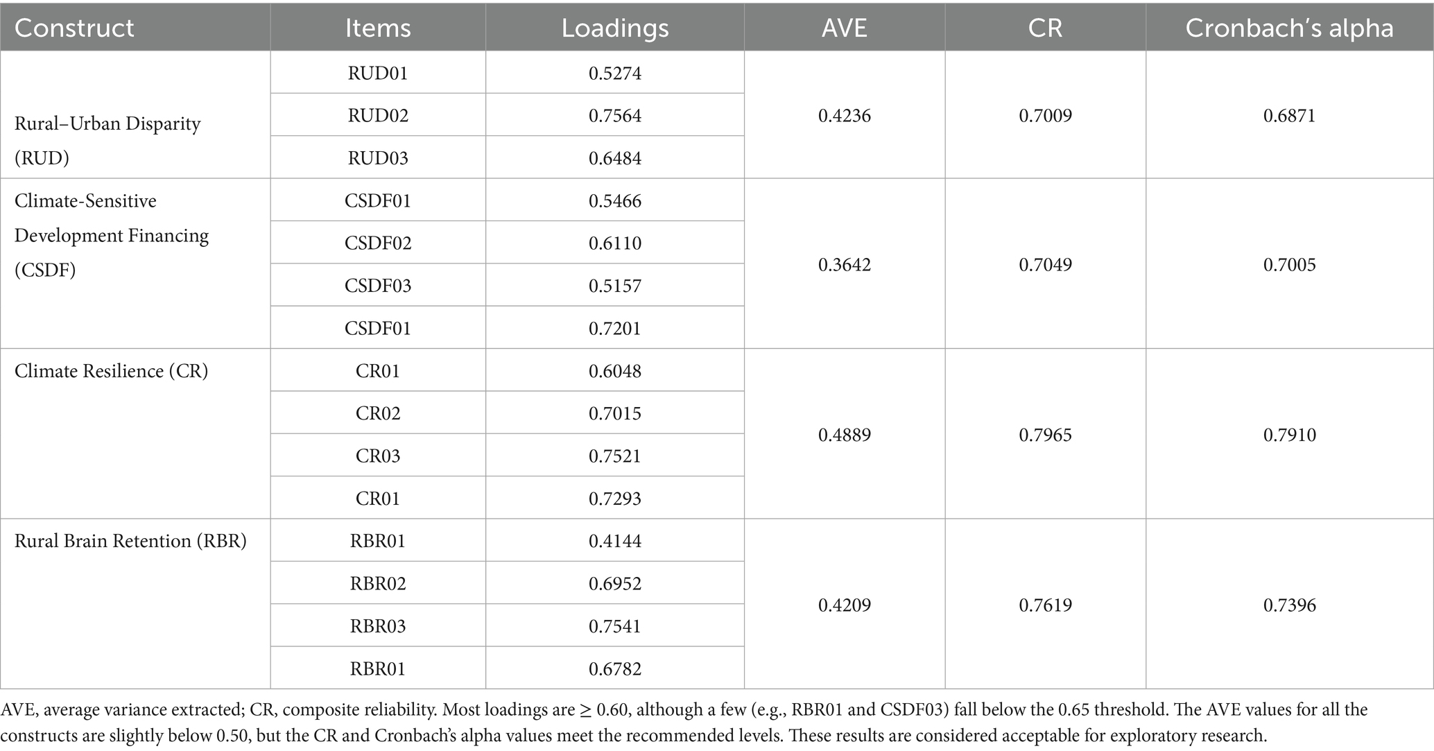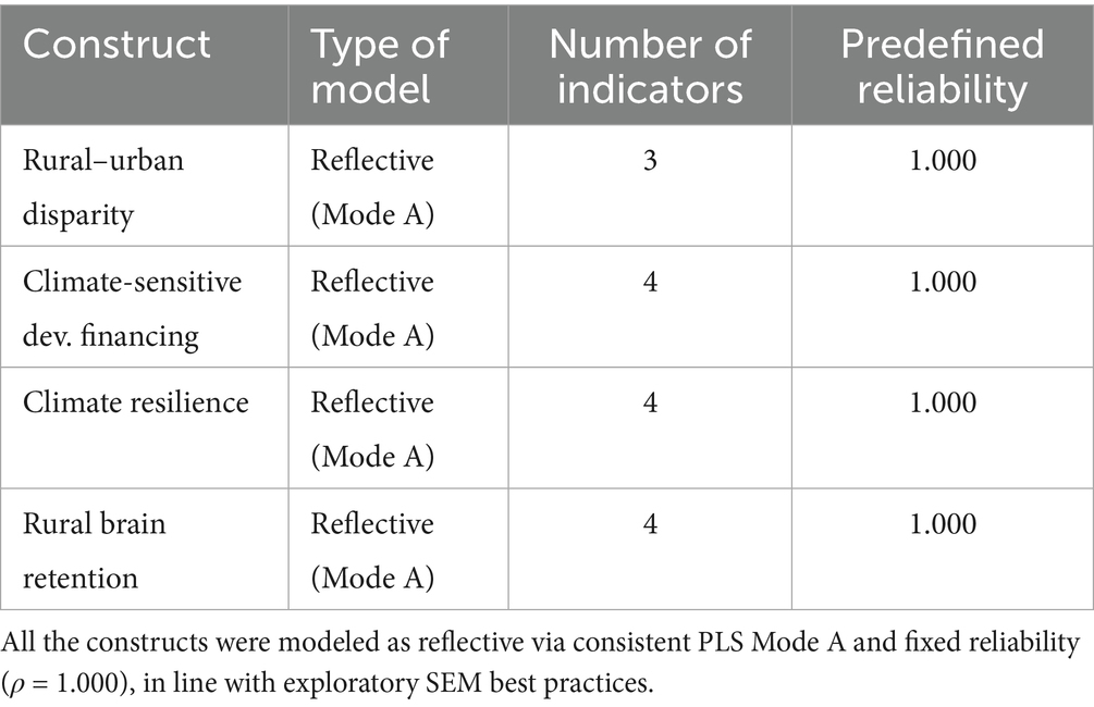 The study’s four key constructs—climate finance, rural–urban disparities, rural brain drain, and climate resilience—were conceptualized as latent variables and measured using multi-item indicators derived from an extensive review of the literature and refined through expert consultations to ensure contextual relevance. Each construct was operationalized through a set of items designed to capture respondents’ perceptions, experiences, and behaviors related to the study themes. Responses were recorded using five- or seven-point Likert-type scales, depending on the nature of the construct, enabling the measurement of varying degrees of agreement or frequency. These scaling decisions align with the analytical requirements of structural equation modeling (SEM) by generating continuous data suitable for latent variable modeling.