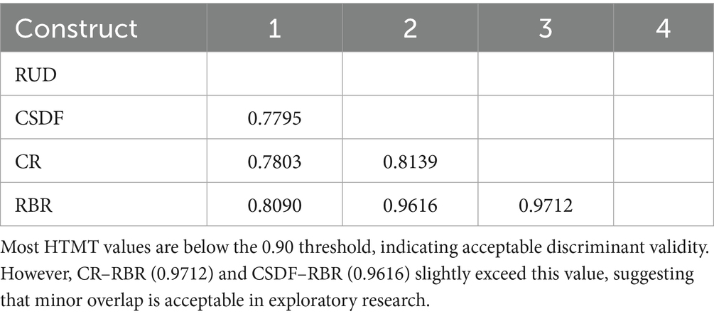 All constructs were modeled as reflective measurement models, meaning that the observed indicators were assumed to reflect their respective latent constructs rather than form them. To ensure the reliability and validity of these measures, a confirmatory factor analysis (CFA) was conducted as a preliminary step before testing the structural model. Internal consistency reliability was evaluated using both Cronbach’s alpha and composite reliability (CR), applying the commonly accepted threshold of 0.70 or higher. Convergent validity was assessed through the average variance extracted (AVE), where values greater than 0.50 were considered acceptable. To establish discriminant validity, Heterotrait–Monotrait (HTMT) criterion was applied, comparing the square root of each construct’s AVE with its correlations with other constructs to confirm that each latent variable captured a unique dimension of the theoretical framework.