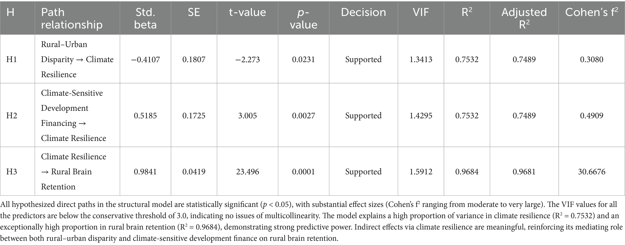 1. Does climate resilience mediate the relationship between climate finance, rural–urban disparities, and rural brain drain?
