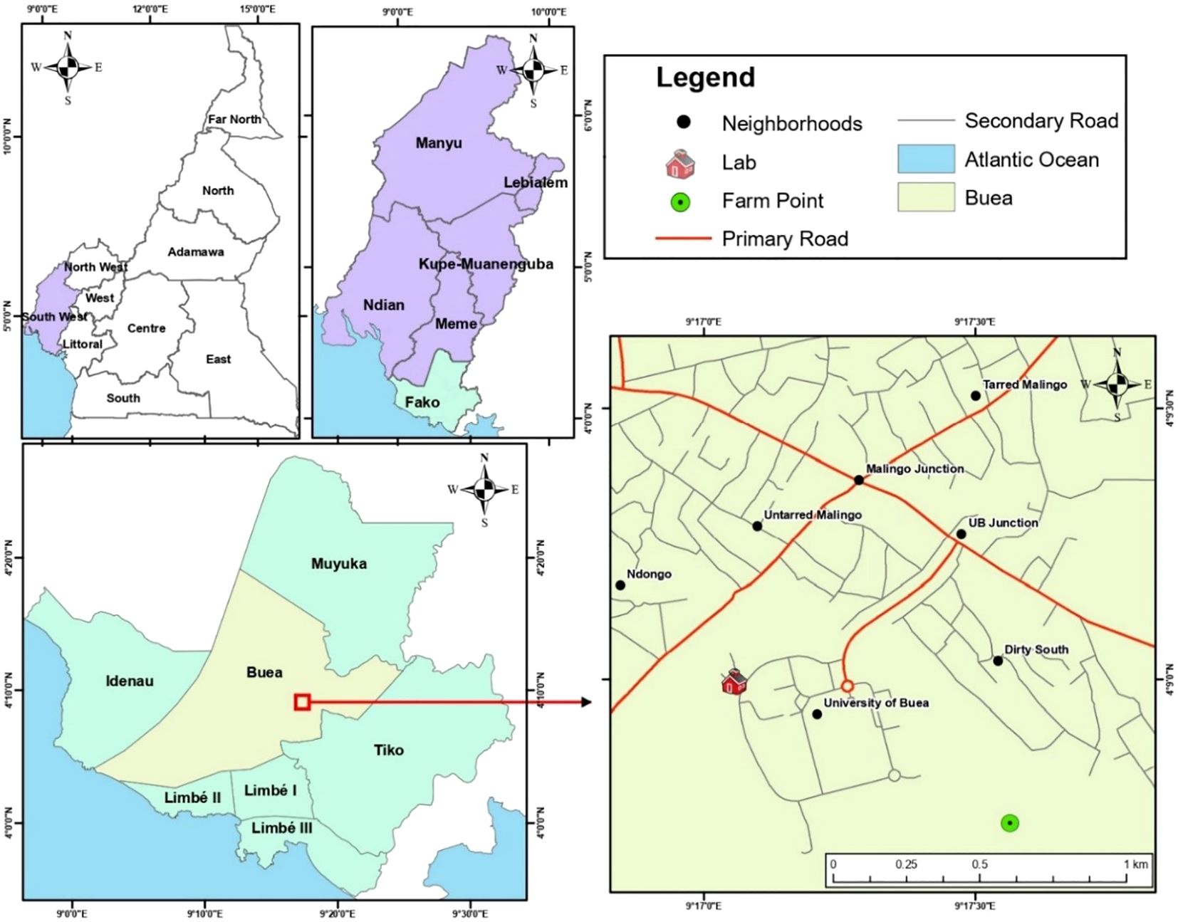 Figure 1. Study area map– illustrating the location of the Southwest Region within Cameroon, the position of Buea within the Southwest Region, and the location of the University of Buea campus.