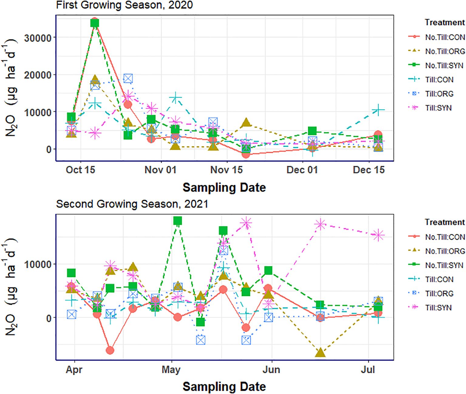 Figure 3. Effects of tillage and fertilizer types on soil N2O emissions in the 2020 and 2021 growing seasons across sample dates.