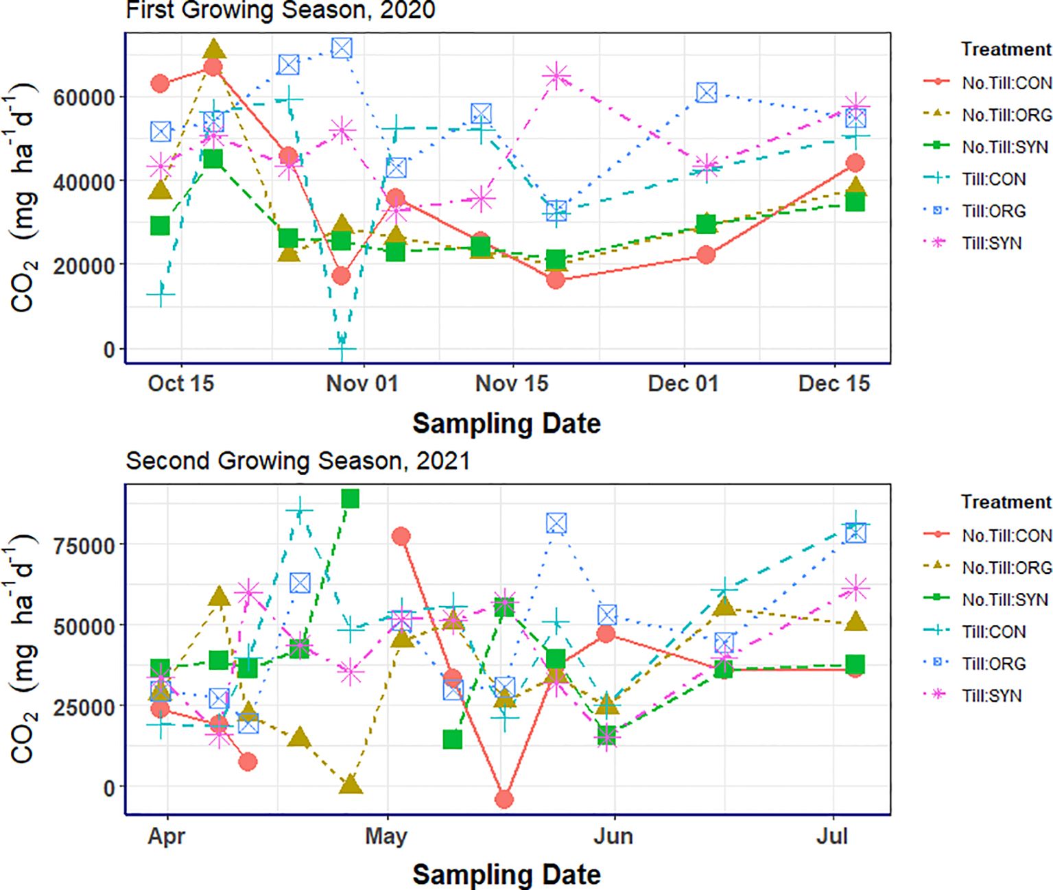 Overall, our findings indicate that tillage practices had a consistent and statistically significant influence on daily CO2 fluxes and cumulative seasonal emissions across both growing seasons. CO2 emissions were markedly higher under conventional tillage, particularly when organic fertilizer was applied. The highest seasonal emissions were observed under the Till + ORG treatment in both years (Table 2), highlighting the synergistic effects of soil disturbance and the addition of labile organic carbon through compost on soil respiration.