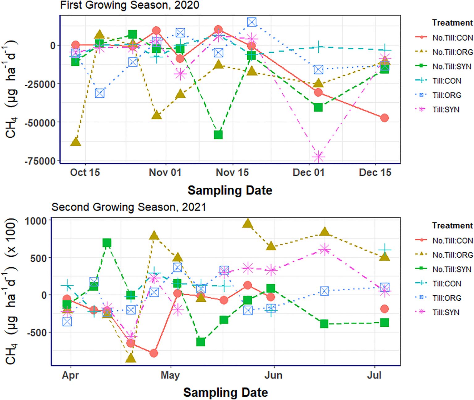 Figure 5. The effects of tillage and fertilizer types on daily soil CH4 emissions in the 2020 and 2021 growing seasons.