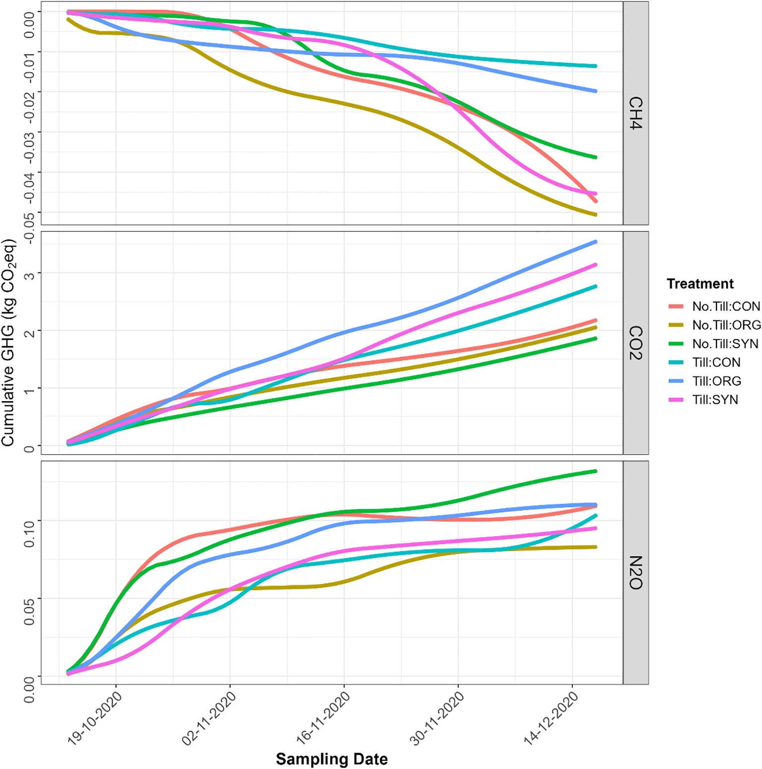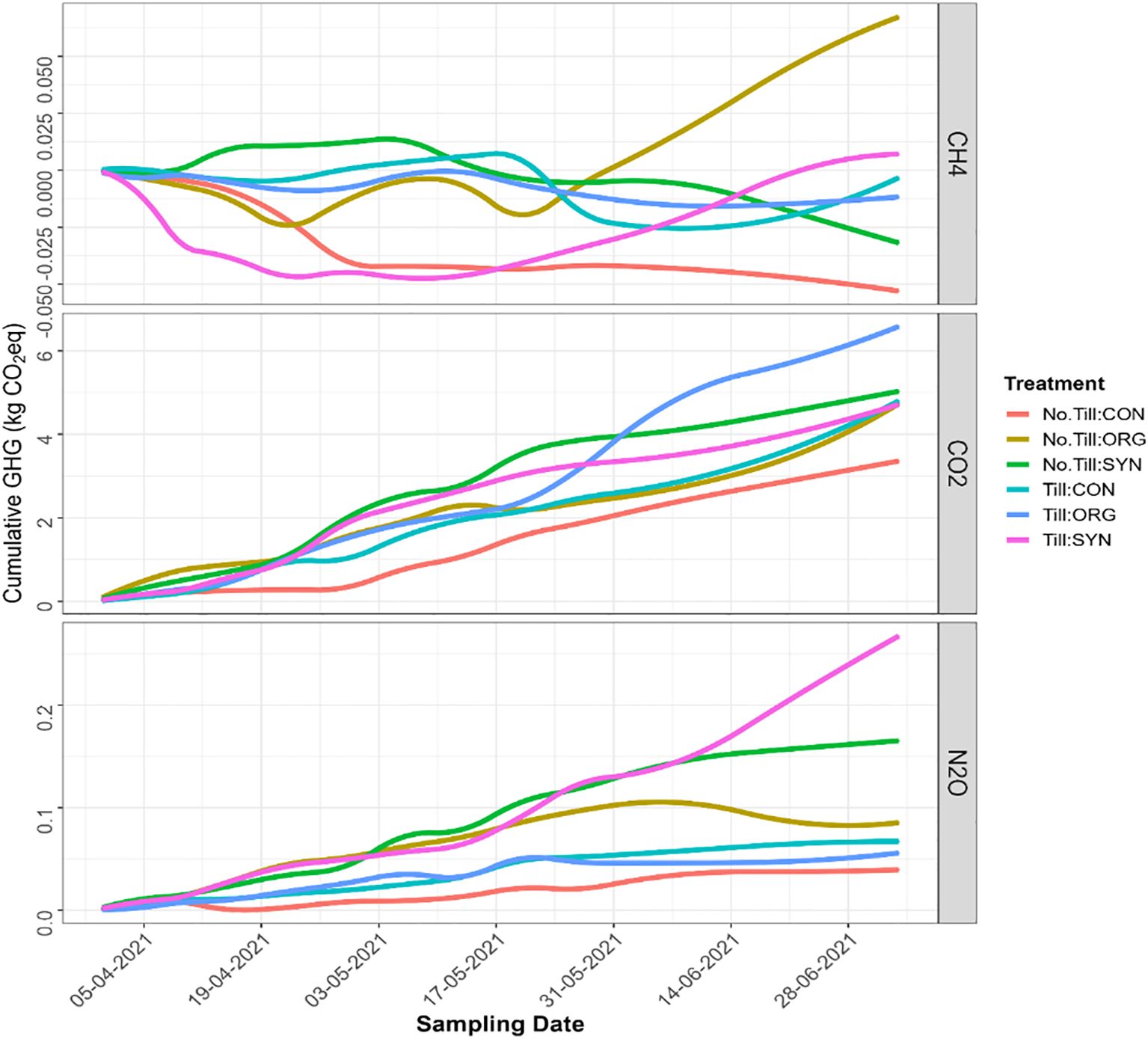 The study concludes that in the 2020 season, cumulative N2O emissions were highest under NoTill + SYN, while CO2 emissions peaked under Till + ORG. Although all CH4 fluxes were negative, indicating net methane uptake, their relative magnitudes varied across treatments, with Till + CON showing the least negative values. In 2021, N2O emissions were greatest under Till + SYN, and CO2 emissions again peaked under Till + ORG. Although the NoTill + ORG treatment recorded slight positive CH4 emissions, most treatments remained net methane sinks, affirming the role of well-aerated upland soils in CH4 oxidation.