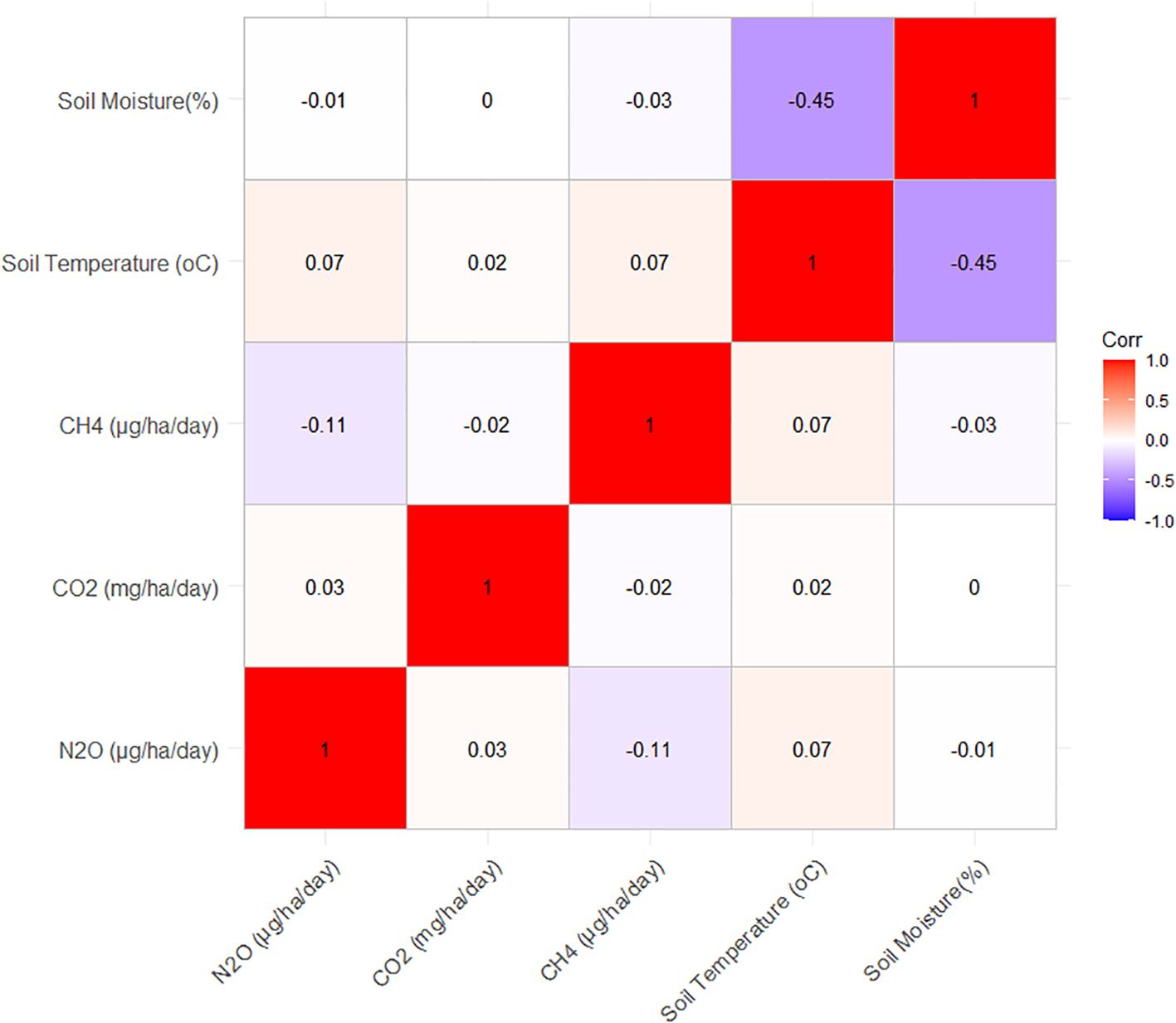 Our results revealed weak relationships between GHG emissions and measured environmental variables (Figure 8). N2O emissions exhibited a weak positive correlation with soil temperature (0.07) and almost no correlation with soil moisture (-0.01). CO2 emissions had a very weak positive correlation with soil temperature (0.02) and no correlation with soil moisture (0). Methane emissions also had a weak positive correlation with soil temperature (0.07) and a weak negative correlation with soil moisture (-0.03) (Figure 8).