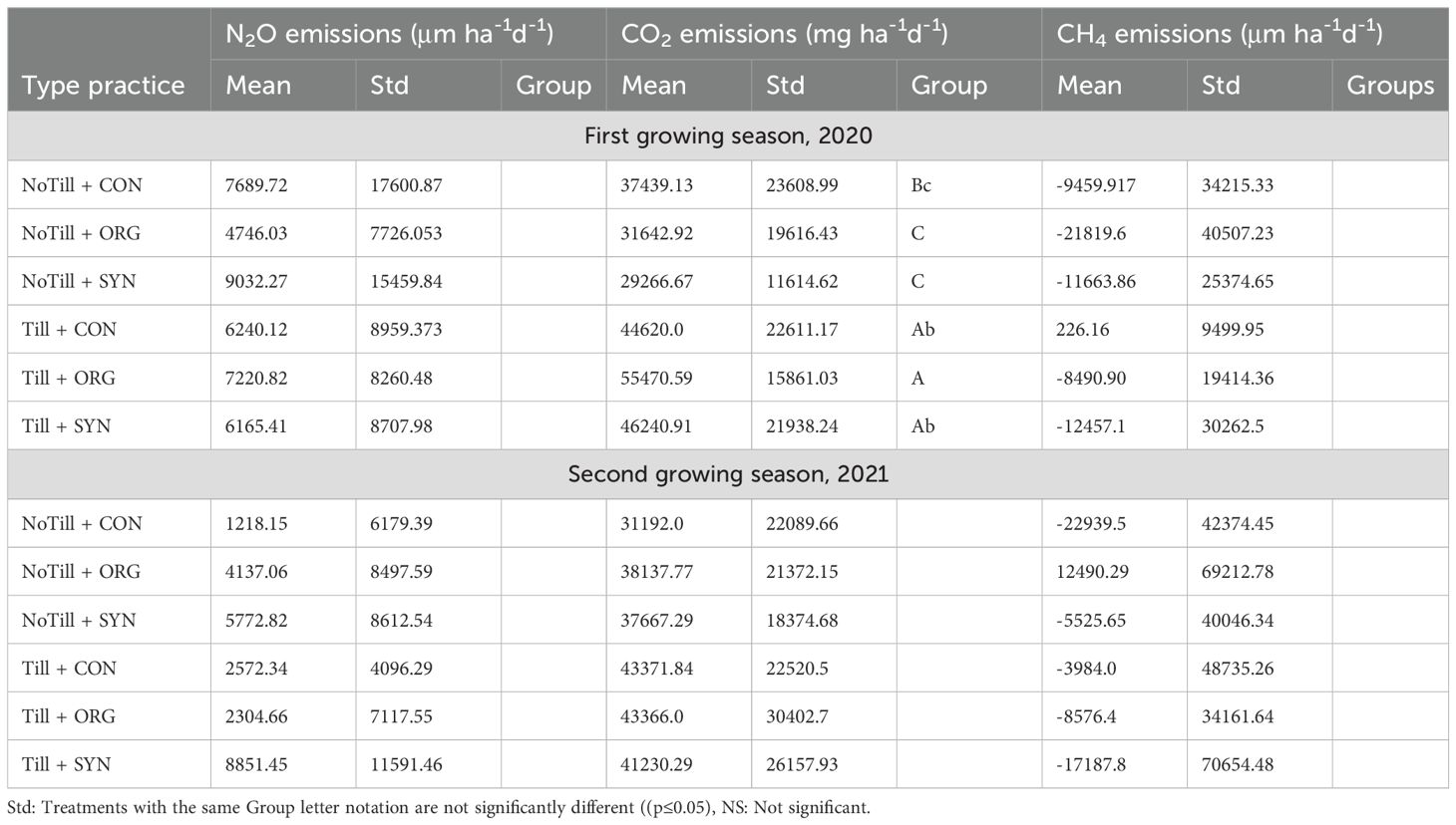 Table 2. Summary statistics showing the interaction effect of tillage and fertilizer types on GHG (N2O, CO2 and CH4) emissions in the 2020 and 2021 growing seasons.
