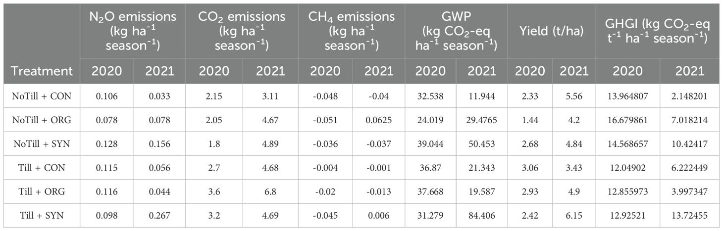 In 2021, GWP increased sharply under Till + SYN (84.41 kg CO2-eq ha-¹ season-¹), more than doubling its 2020 value, while NoTill + SYN also exhibited a high GWP (50.45 84.41 kg CO2-eq ha-¹ season-¹). The lowest GWP was recorded in NoTill + CON (11.94 kg CO2-eq ha-¹ season-¹). GHGI followed a similar pattern, with the lowest value under NoTill + CON (2.15 kg CO2-eq t-¹ ha-¹ season-¹) and the highest under Till + SYN (13.72).