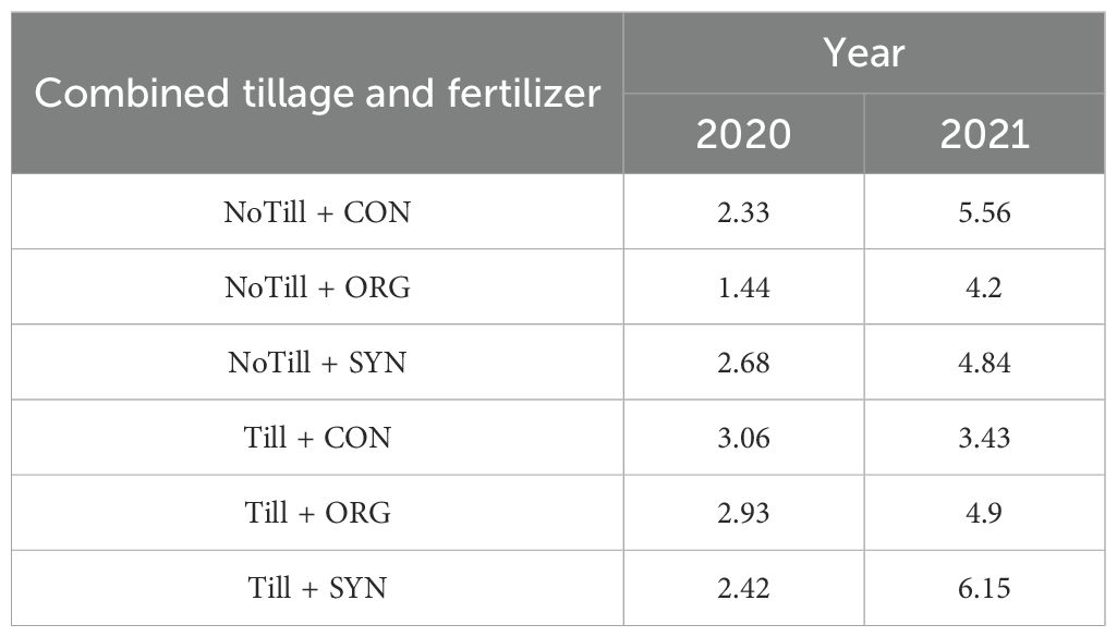 Table 4. Effects of tillage and fertilizer types on maize productivity in the 2020 and 2021 growing season.