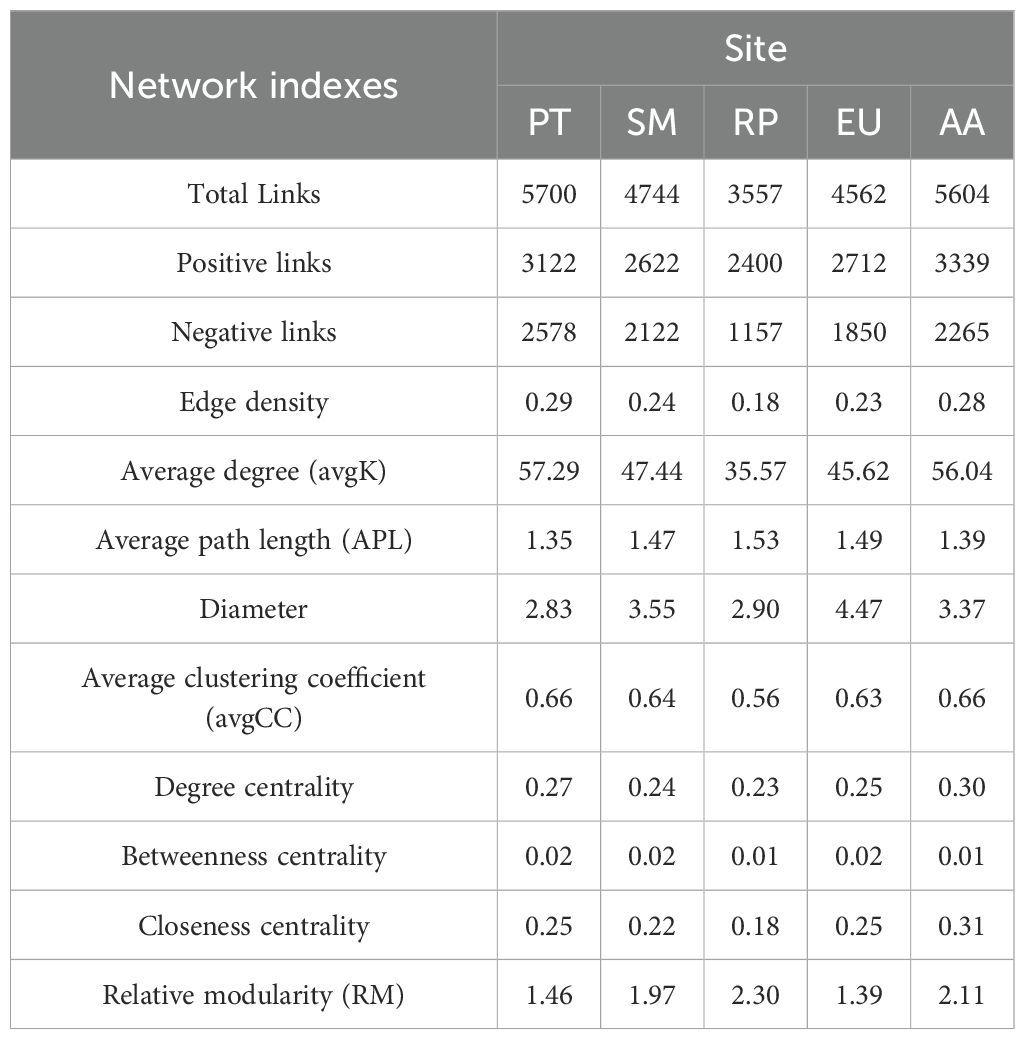 Table 1. Topological properties of the co-occurrence networks in the PT, SM, RP, EU and AA forest.