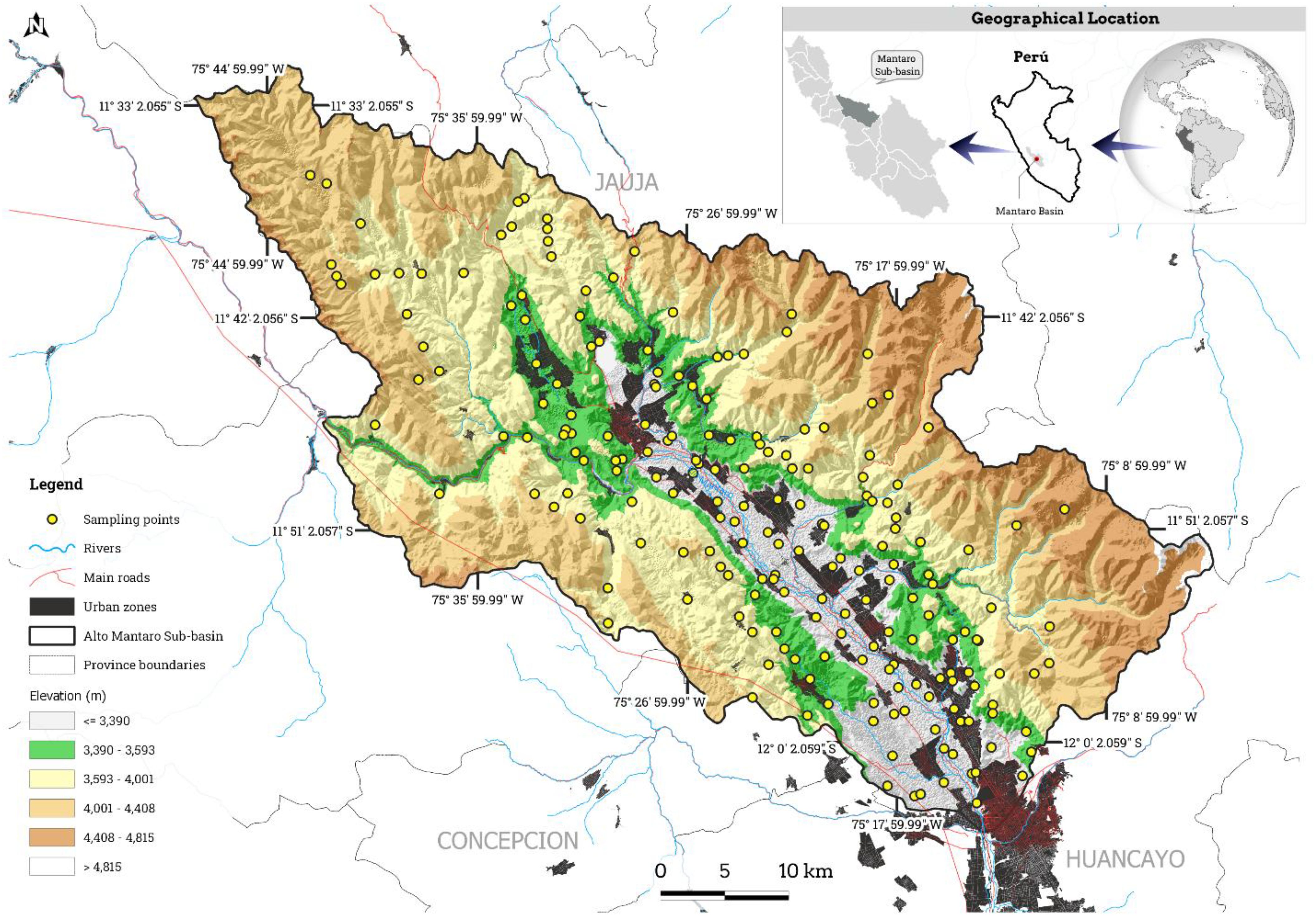 The Alto Mantaro sub-basin (11°30’-12°04’S, 75°05’-75°49’W) encompasses 2,114.82 km² in the northwestern Mantaro River basin (Figure 1). As indicated on the Warren Thornthwaite climate classification map provided by the Peruvian National Meteorology and Hydrology Service (SENAMHI), the most important area is characterized by a semi-dry, temperate, and humid climate throughout the year (53). The data indicates a maximum temperature range of 21-25°C, a minimum range of 7-11°C, and annual precipitation estimates between 700 and 2000 millimeters. Leptosols are the most common soil type, characterized by their shallow depth, stony composition, poor development, and lack of distinct features. Formed on solid rock in mountainous regions, these areas are highly susceptible to erosion and have limited agricultural value, though they are used for extensive grazing (54). According to the Ecological and Economic Zoning of the Junín department, the study area exhibits predominant soil textures of sandy loam (34.87%), loam (12.75%), and clay loam (9.65%). The vegetation is primarily Andean grasslands, which account for over 50% of the total area. Moderately steep hills and mountains (15-25° slopes) constitute 26.70% of the area, and agricultural lands span 672.07 km² (31.77%) across the Mantaro Valley provinces of Jauja, Concepción, and Huancayo (55). The sub-basin encompasses 59 districts and 438 population centers, comprising 356,440 inhabitants and 89,345 dwellings (56).