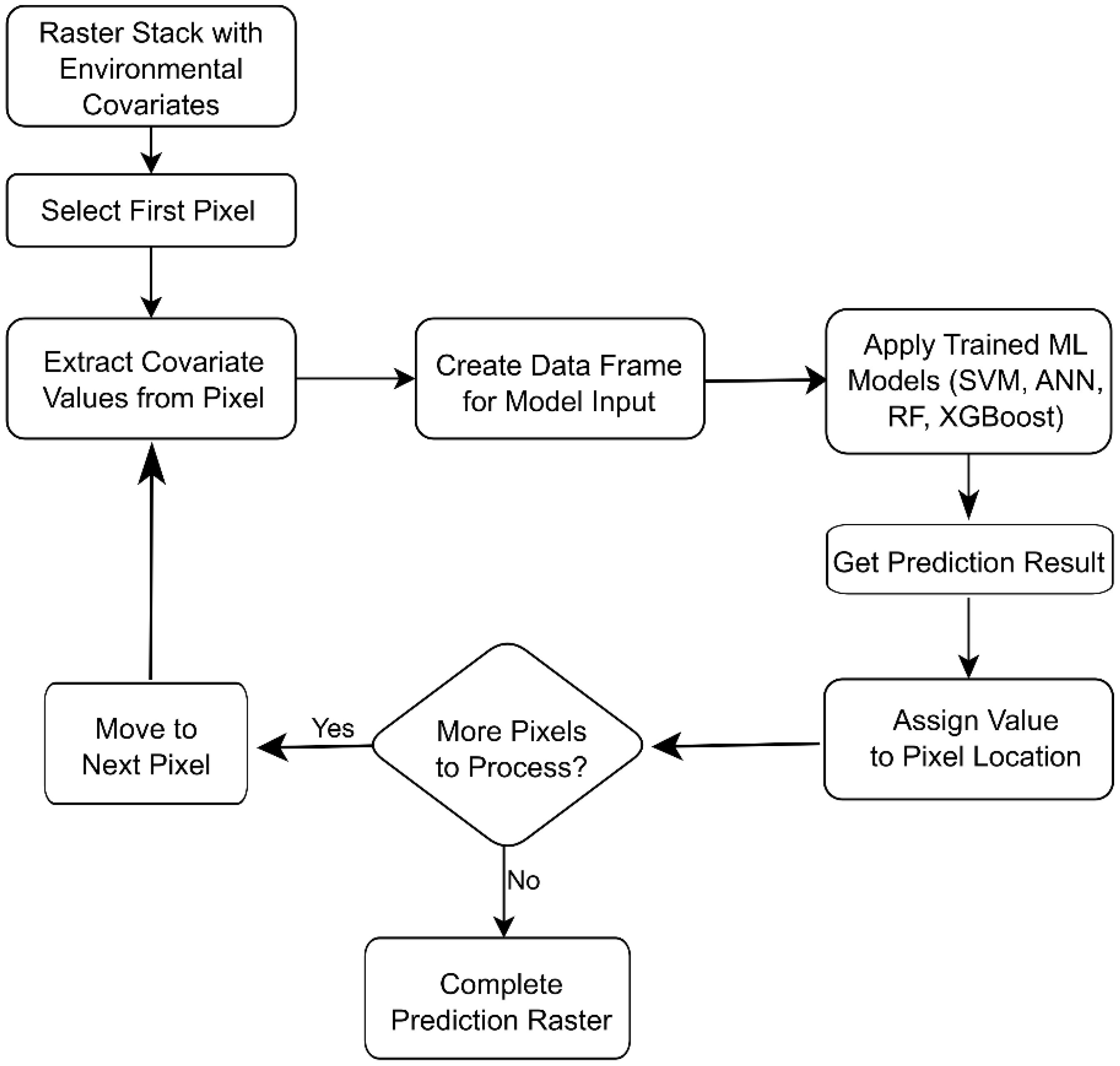 Raster predictions of pH and EC were generated for the entire study area using trained ML models to create continuous spatial maps. The main methodology, illustrated in the flowchart (Figure 3), involved pixel-by-pixel model application across the study area using the terra package’s predict function. Previously, the input data required preprocessing steps such as scaling, which was crucial for scale-sensitive models like SVM and ANN. Additionally, imputation was necessary to manage missing values (NA pixels); otherwise, a single missing pixel could have rendered the entire prediction invalid. Raster predictions were created for every ML model and both ensemble methods that were evaluated.