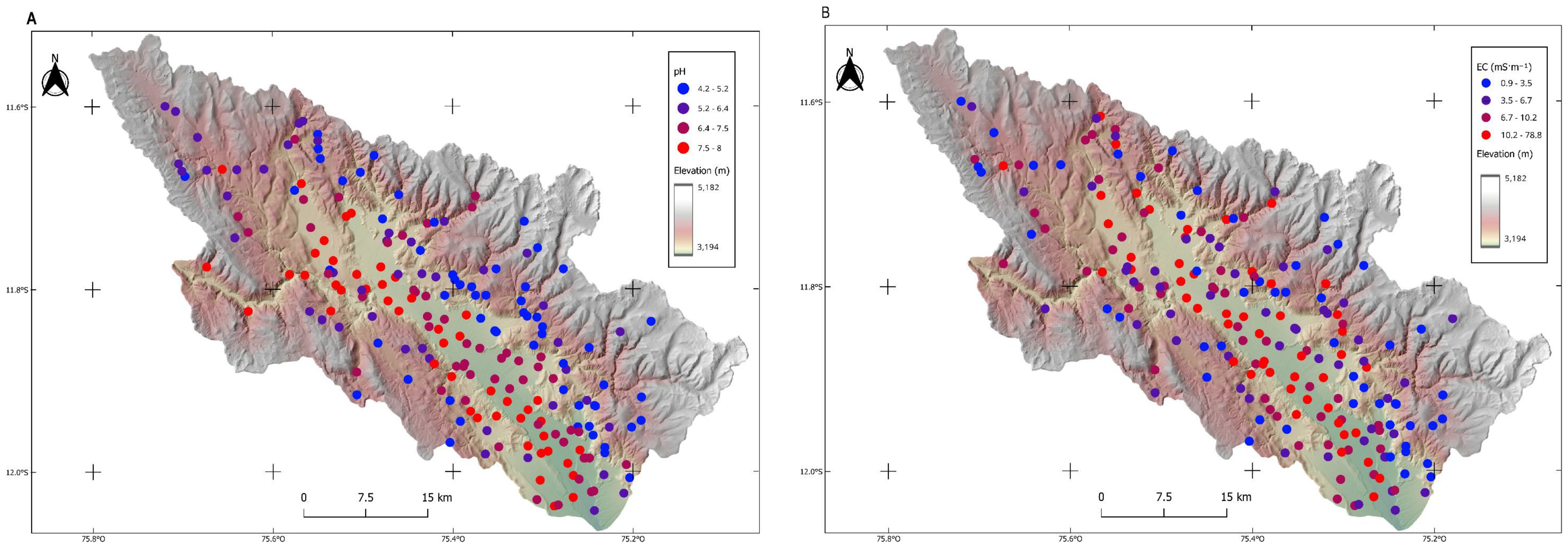Andean soil pH and EC show substantial variability, where EC displays notably higher variability and positive skewness compared to pH. We identified distinct spatial patterns using spatial autocorrelation analysis (Moran’s I, Geary’s C, LISA), which shows strong, statistically significant spatial clustering for pH, indicating dominant landscape-level controls. In contrast, EC exhibits moderate spatial autocorrelation, suggesting its distribution is more influenced by localized factors.