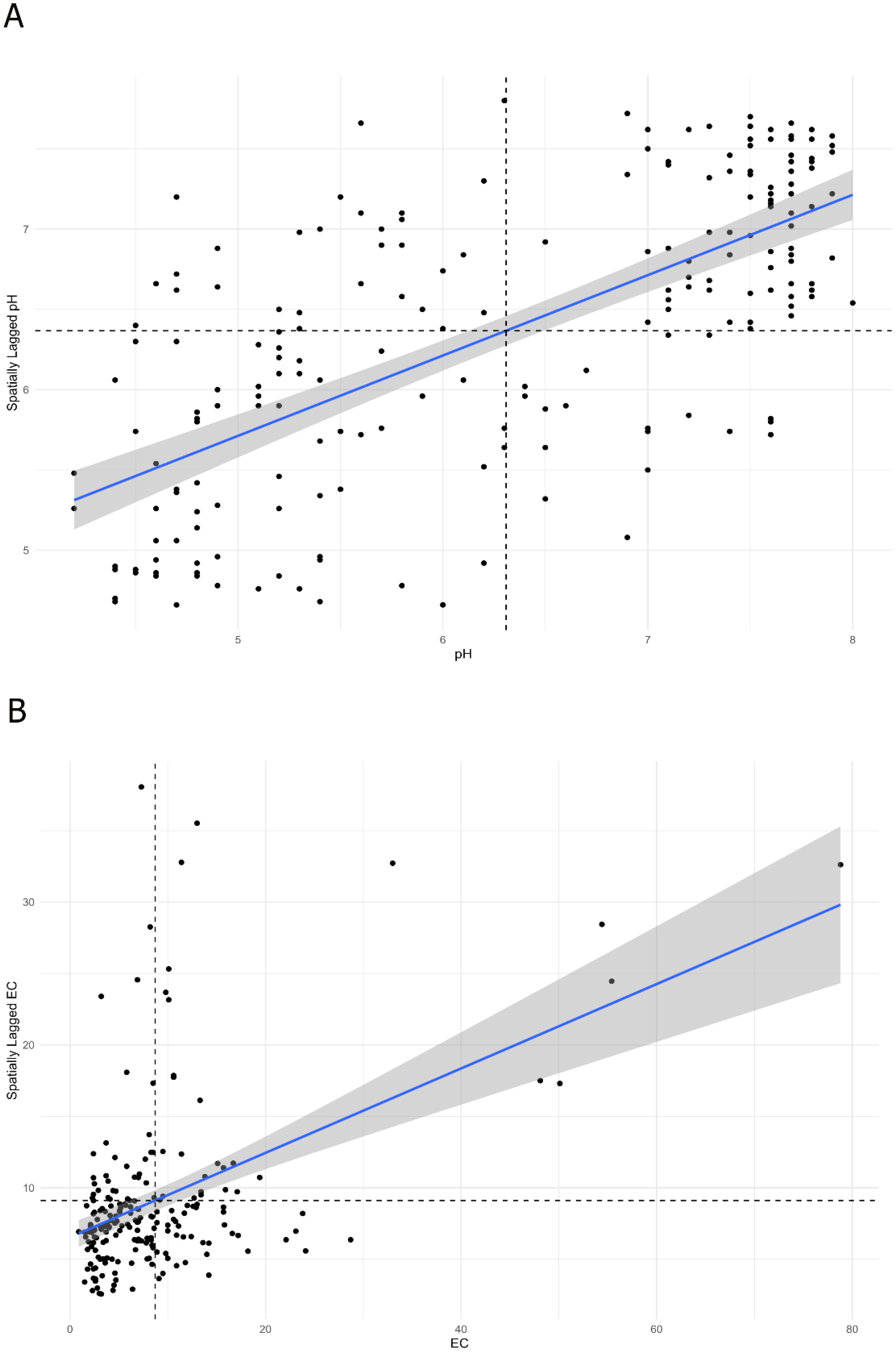 A Moran scatterplot was used to visualize the relationship between variables and their spatially lagged neighbors in the autocorrelation analysis. The pH plot displayed a strong positive correlation, with data points clustering densely in the high-high (HH, top-right) and low-low (LL, bottom-left) quadrants, demonstrating pronounced spatial autocorrelation (Figure 5A). In contrast, the EC plot exhibited a similar positive trend but with greater scatter and notable presence of outliers in the high-low (HL, top-left) and low-high (LH, bottom-right) quadrants, indicating moderate positive spatial autocorrelation with more heterogeneous spatial patterns (Figure 5B).