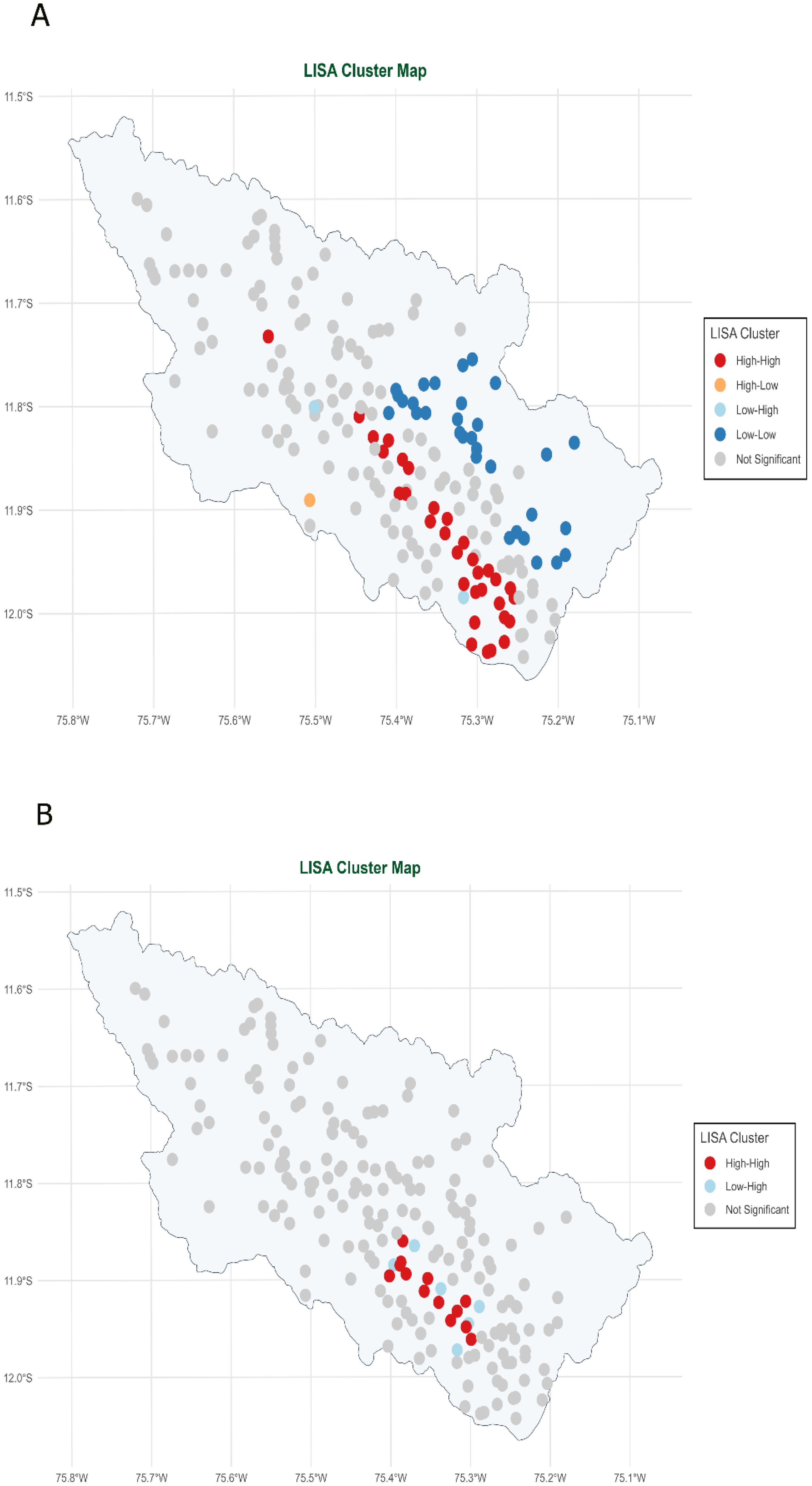 Spatial autocorrelation in geographical data is often measured using Moran’s I and Geary’s C (71, 72). A Moran’s I value close to +1 signifies robust positive spatial autocorrelation, whereas values near -1 denote spatial dispersion. In contrast, Geary’s C demonstrates an inverse association; accordingly, lower Geary’s C values reflect increased clustering within the data. To define spatial neighbors, we utilized the spdep package (73). Graphics such as the Moran scatterplot enable the visualization of the relationship between the value at each location and the values of neighboring locations. This indicates whether the data exhibits positive spatial autocorrelation (where similar values cluster together), negative spatial autocorrelation (where dissimilar values cluster together), or no autocorrelation (indicating a random distribution). We used Local Indicators of Spatial Autocorrelation (LISA) cluster classification to generate a spatial representation with significant clusters: “High-High” (hotspots), “Low-Low” (cold spots), “High-Low” (spatial outliers), and “Low-High” (spatial outliers).