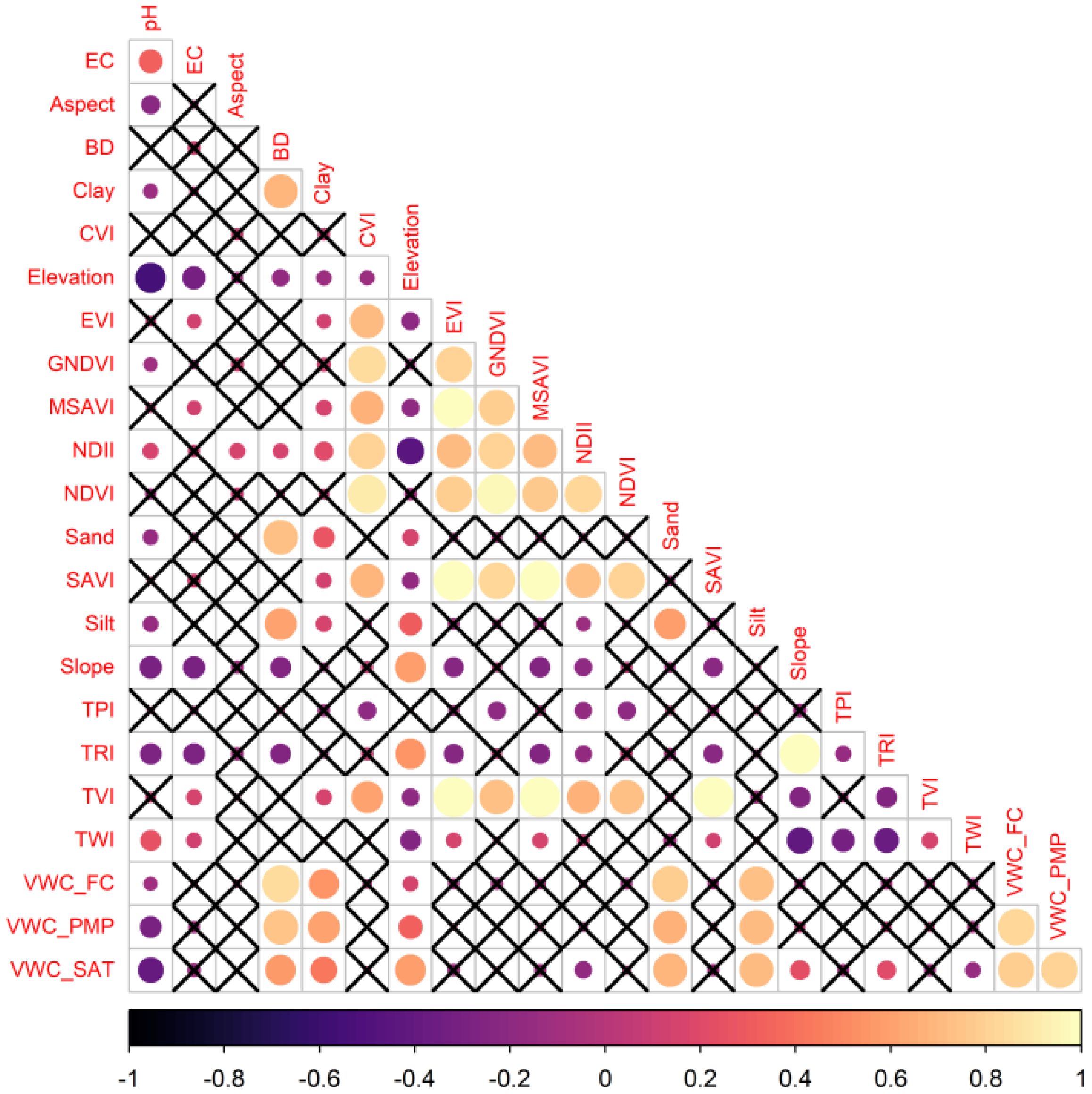 Strong internal correlations within variable clusters were observed through correlation matrix (Figure 7), suggesting that multicollinearity may be present in the dataset. High positive correlations represented with larger circles were detected among the moisture variables (VWC_FC, VWC_PMP, and VWC_SAT), indicating that similar aspects of soil water content were being assessed by these measures. Potential redundancy in vegetation measurements was suggested by the moderate to strong correlations found among vegetation indices (GNDVI, MSAVI, NDVI, and SAVI). Similar correlation patterns were observed for topographic variables (elevation, slope, and TPI), indicating comparable spatial relationships. In contrast, diverse correlation patterns (smaller circles) were exhibited by variables such as clay, silt, sand, and topographic indices (TRI, TWI), suggesting that unique insights could contribute to model development by these parameters. In addition, we can appreciate “X” symbol, which indicates correlations that are not statistically significant at the 0.10 significance level (90% confidence).