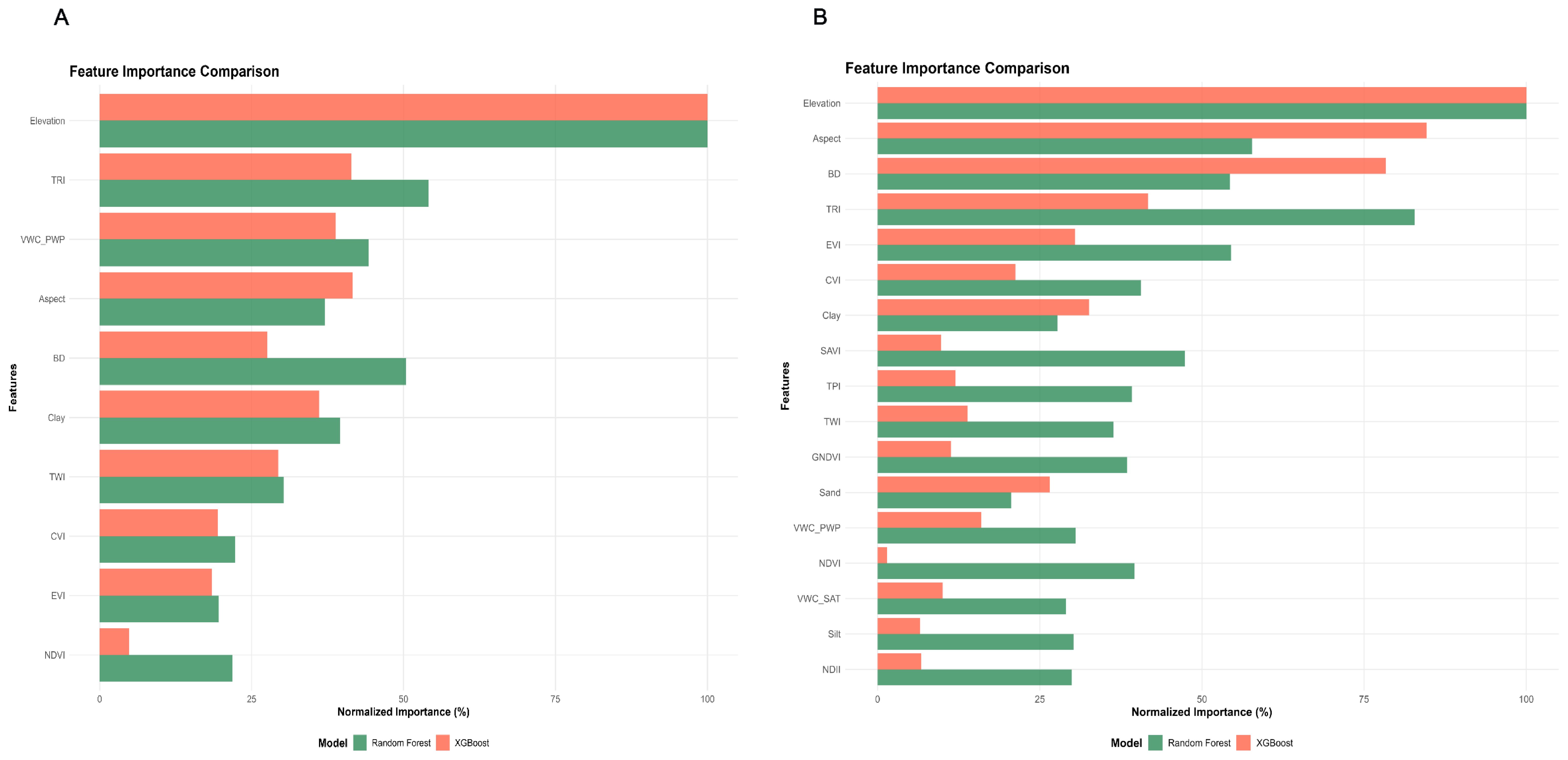 The relative contributions of environmental and soil covariates to soil pH and EC prediction were assessed through feature importance analysis comparing RF and XGBoost models. For pH prediction (Figure 8A), ten features were evaluated: Elevation, TRI, VWC_PWP (Volumetric Water Content at Permanent Wilting Point), Aspect, BD, Clay, TWI, CVI, EVI, and NDVI. Elevation emerged as the dominant predictor in both models, demonstrating the highest normalized importance (>90%) and underscoring its critical role in pH spatial distribution. Notable differences between models were observed, with RF consistently assigning higher importance to most features compared to XGBoost, particularly for TRI, VWC_PWP, and BD. For EC prediction (Figure 8B), the feature set was expanded to include SAVI, GNDVI, NDII, TPI, Sand, Silt, and VWC_SAT (Volumetric Water Content at Saturation). Elevation and Aspect dominated the prediction framework, accounting for over 90% and 80% of feature importance respectively in both models. Model-specific preferences were again evident, with RF assigning greater importance to TRI, EVI, and SAVI, while XGBoost emphasized Aspect and BD more heavily.