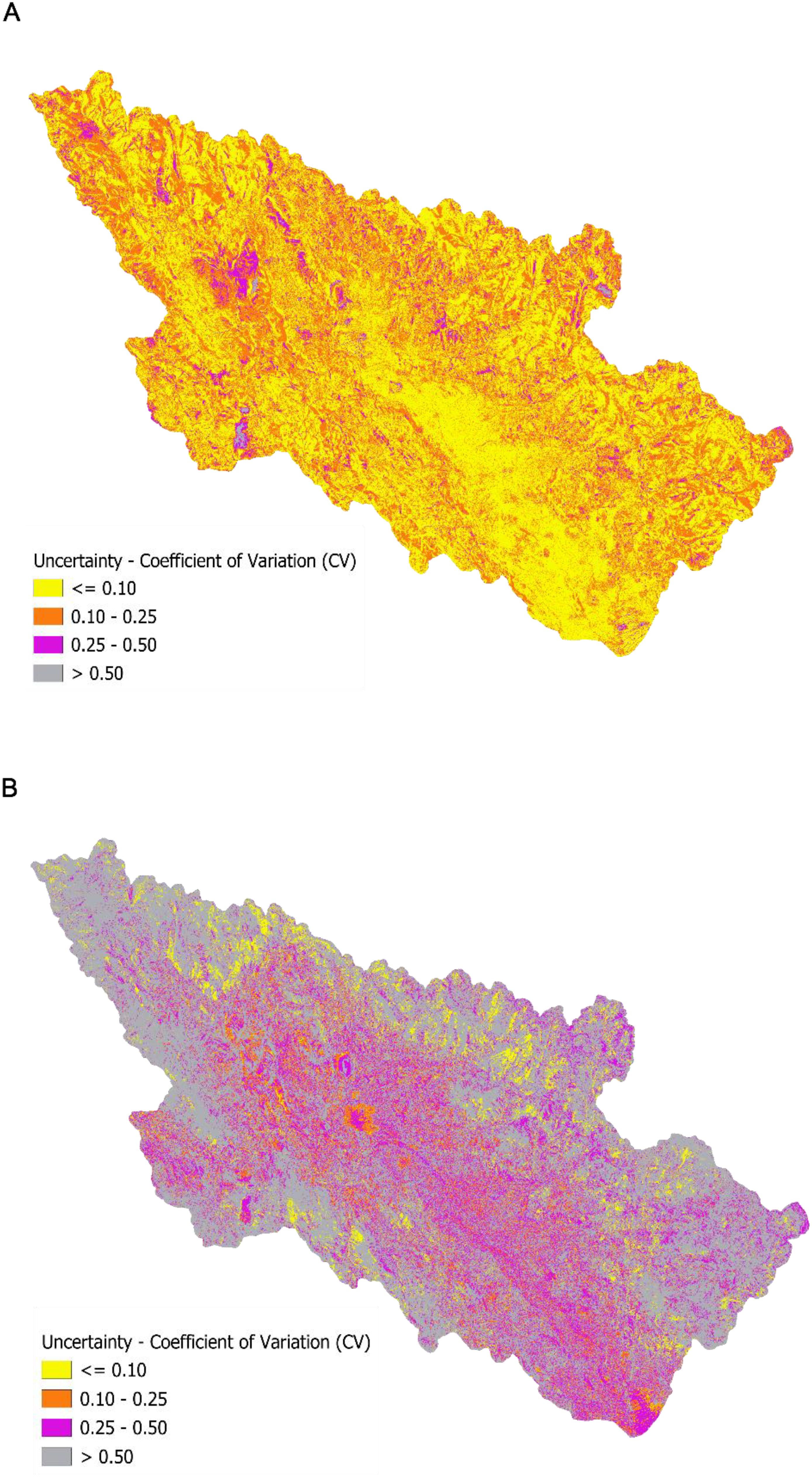 Figure 11. (A) Relative disagreement between ensemble weighted model predictions according to coefficient of variation maps for pH. (B) Relative disagreement between ensemble weighted model predictions according to coefficient of variation maps for electrical conductivity.