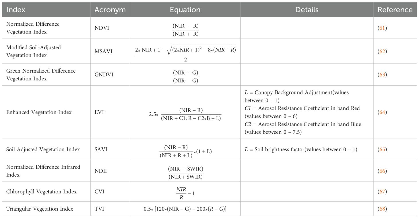 62. Qi J, Chehbouni A, Huete AR, Kerr YH, and Sorooshian S. A modified soil adjusted vegetation index. Remote Sens Environ. (1994) 48:119–26. doi: 10.1016/0034-4257(94)90134-1