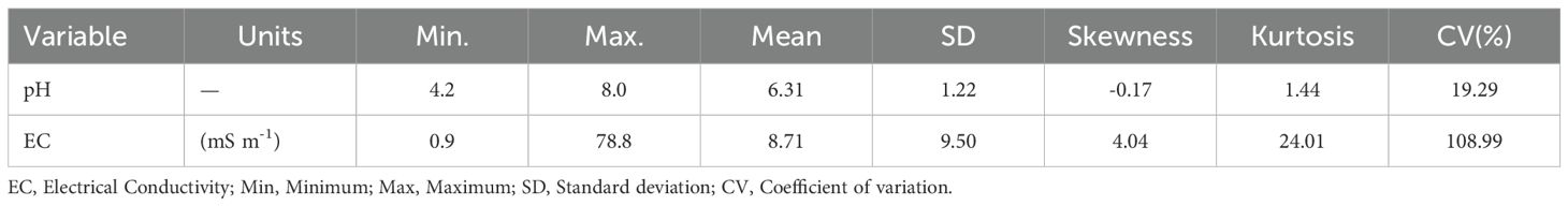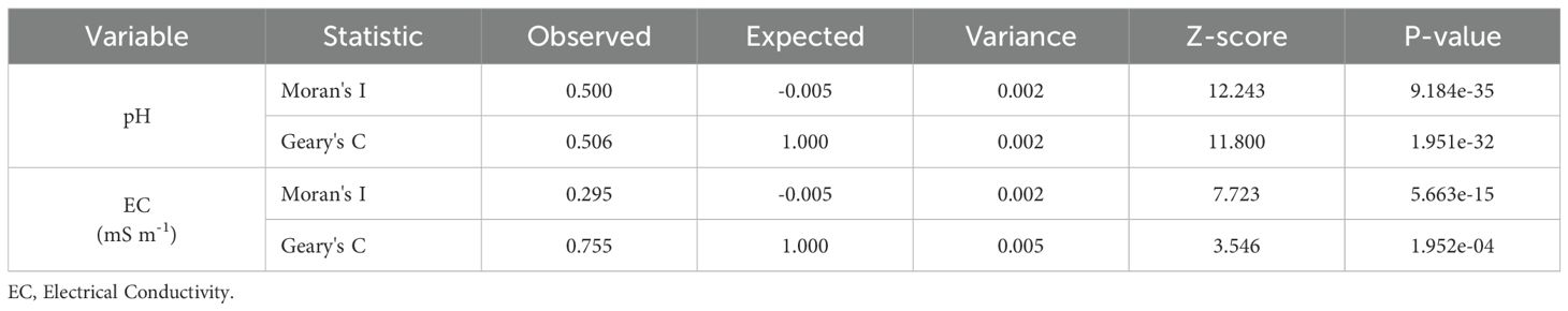 The analysis of spatial autocorrelation, using Moran’s I and Geary’s C, found notable positive autocorrelation in the soil properties. The data in Table 3 reveals a high degree of spatial clustering in soil pH (I = 0.500, C = 0.506, p< 0.001), in contrast to EC, which presents only moderate spatial autocorrelation (I = 0.295, C = 0.755, p< 0.001). The stronger spatial structure that was observed in pH compared to EC indicated that pH distribution was more strongly influenced by landscape-level controls, while more localized variation was exhibited by EC. The use of spatial modeling approaches was justified by these results, and spatial cross-validation was necessitated to avoid overoptimistic performance estimates.