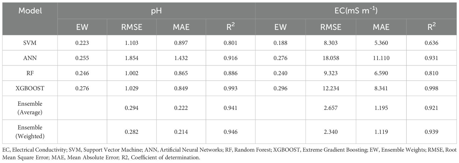 Performance metrics for the four machine learning models (SVM, ANN, RF, XGBoost) and their ensemble approaches (Average and Weighted) in predicting soil pH and EC are presented in Table 4. For soil pH prediction, substantial variation in model effectiveness was observed among individual algorithms. XGBoost demonstrated superior performance with the highest R² (0.993) and lowest MAE (0.849), while RF achieved the lowest RMSE (1.002). Conversely, ANN exhibited the poorest performance across all metrics, recording the highest RMSE (1.854) and MAE (1.432). Each ensemble approach consistently outperformed all individual models, with significant improvements in error reduction and prediction accuracy. The ensemble methods effectively leveraged the strengths of individual algorithms while mitigating their respective weaknesses, resulting in more robust and reliable soil property predictions. The Weighted Ensemble proved to be the superior model overall, achieving the lowest RMSE (0.282) and MAE (0.214), along with a very strong R² of 0.946. This represents a remarkable 72% reduction in RMSE compared to the best individual model (RF) and a 75% reduction in MAE compared to the best individual model (XGBoost), clearly demonstrating the power of the ensemble approach in generating more accurate and reliable pH predictions.