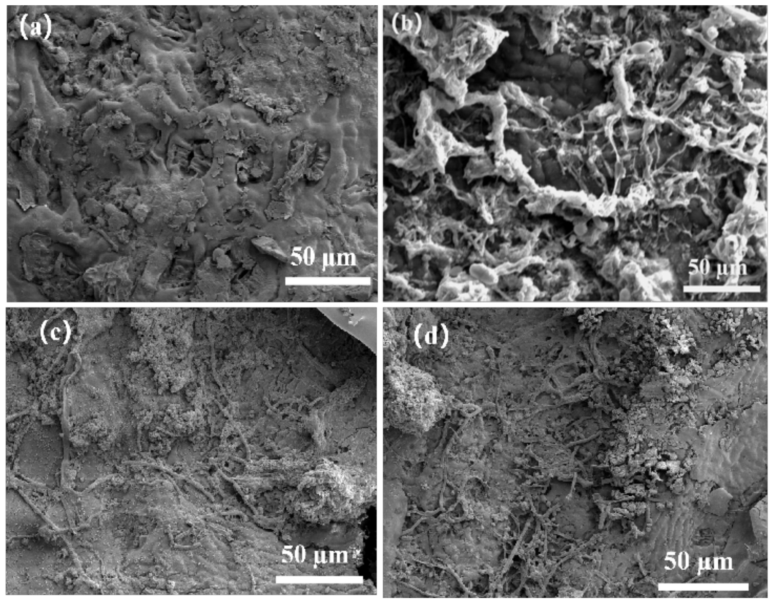 Figure 2. Scanning electron microscopy (SEM) of poplar leaves before and after decomposition under different treatments. (a) Initial poplar leaves; (b–d) leaves under CK, CJ, and CJ25 treatments at 120 days of decomposition.