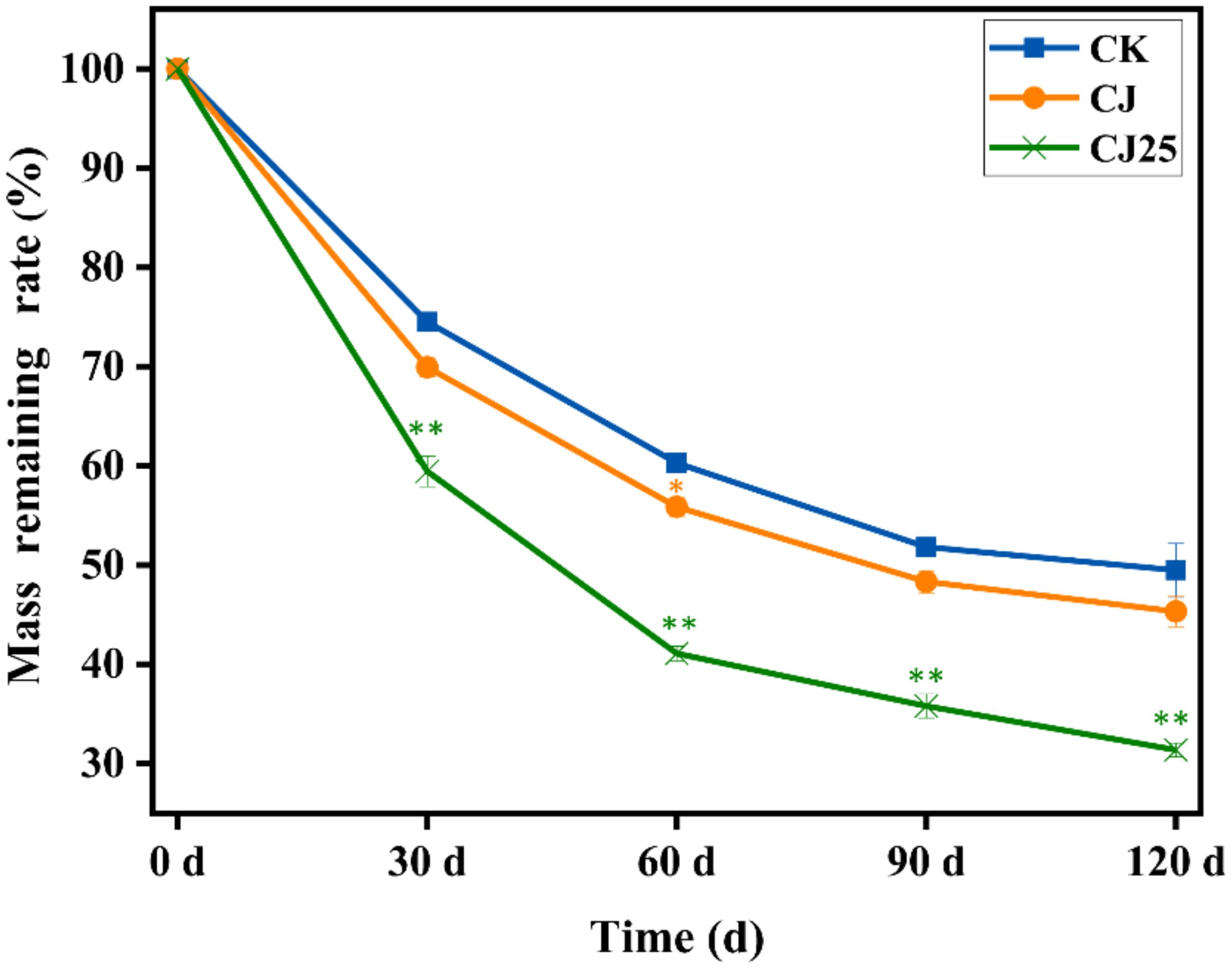 Changes in litter mass loss rate are shown in Figure 3. The litter mass loss rates of all three treatments increased rapidly at first and then gradually leveled off. The mass loss rate in the CJ25 treatment was consistently higher than those under CK and CJ. At 30, 60, and 90 days, the decomposition rates under CK were 25.5%, 39.7%, and 48.2%, respectively. Under CJ, the rates were 30.1%, 44.1%, and 51.7%, while those under CJ25 were 40.6%, 58.9%, and 64.2%, which were 10.5%, 14.8%, and 12.5% higher than CJ, respectively, showing significant differences (p<0.05). At 120 days, the mass loss rates of CK, CJ, and CJ25 were 50.5%, 57.7%, and 65.6%, respectively, with CJ25 being 7.9% higher than CJ (p < 0.05).