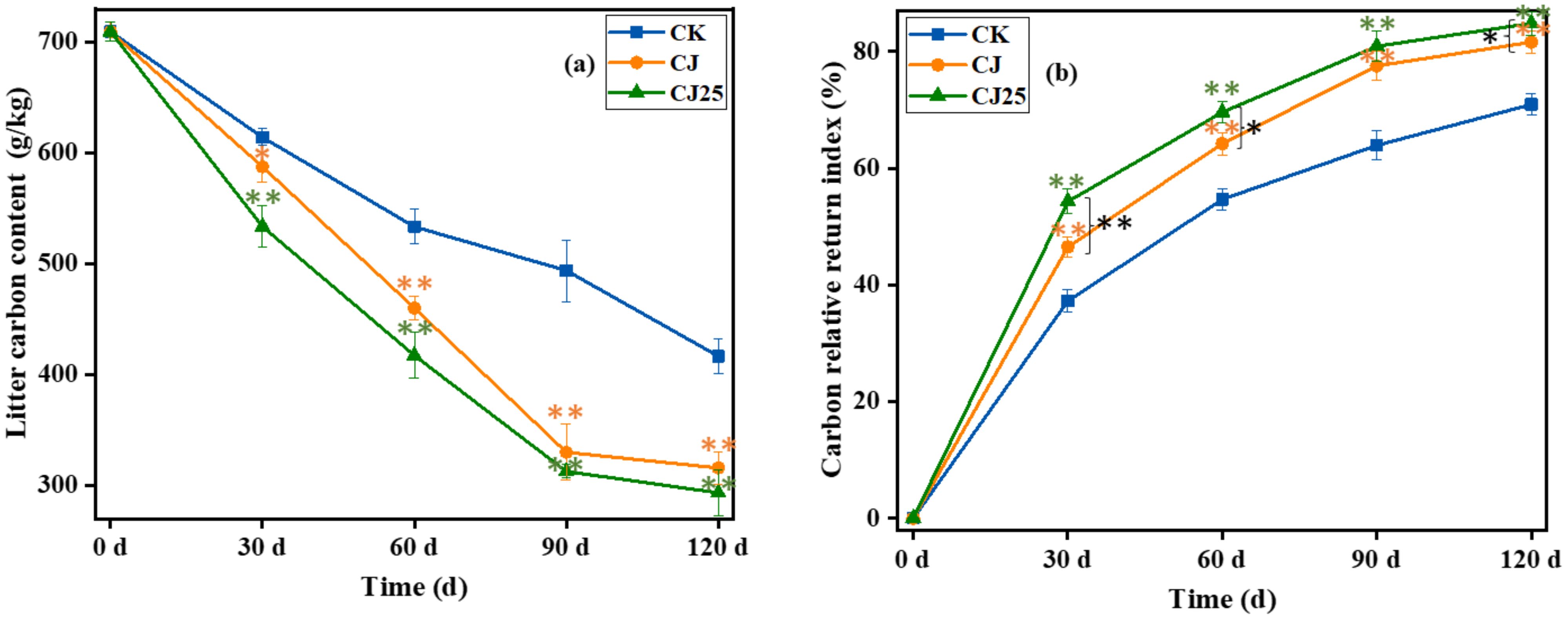 Figure 4. Effects of different treatments during the litter decomposition process over time: (a) litter total carbon content and (b) carbon relative return index. In the line charts, error bars represent the standard deviations from three biological replicates (litterbags). Data were statistically analyzed using two-way analysis of variance (two-way ANOVA). Significance is indicated with asterisks (*p<0.05, **p<0.01).