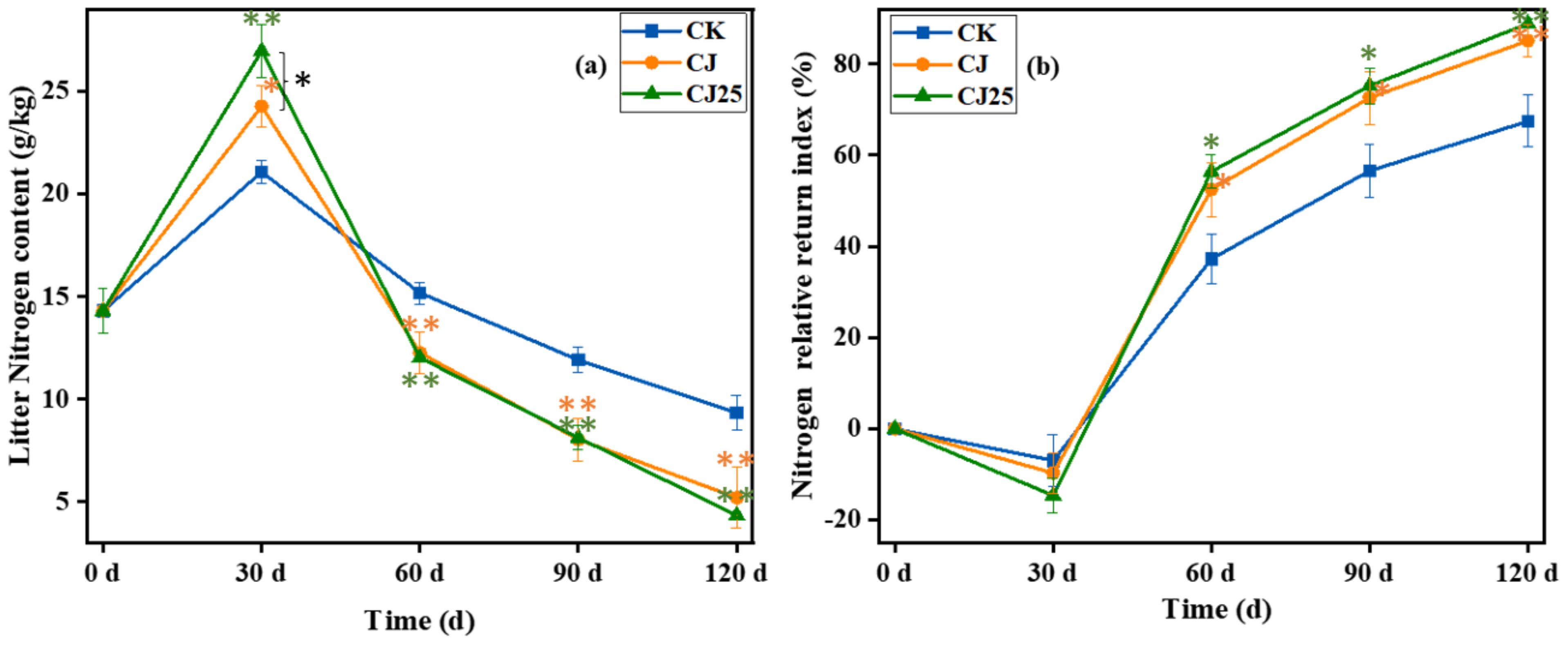 Figure 5. Effects of different treatments on nitrogen content during the litter decomposition process as a function of time: (a) litter total nitrogen content and (b) nitrogen relative return index. In the line charts, the error bars represent the standard deviations from three biological replicates (litterbags). Data were statistically analyzed using two-way analysis of variance (two-way ANOVA). Significance is indicated with asterisks (*p<0.05, **p<0.01).
