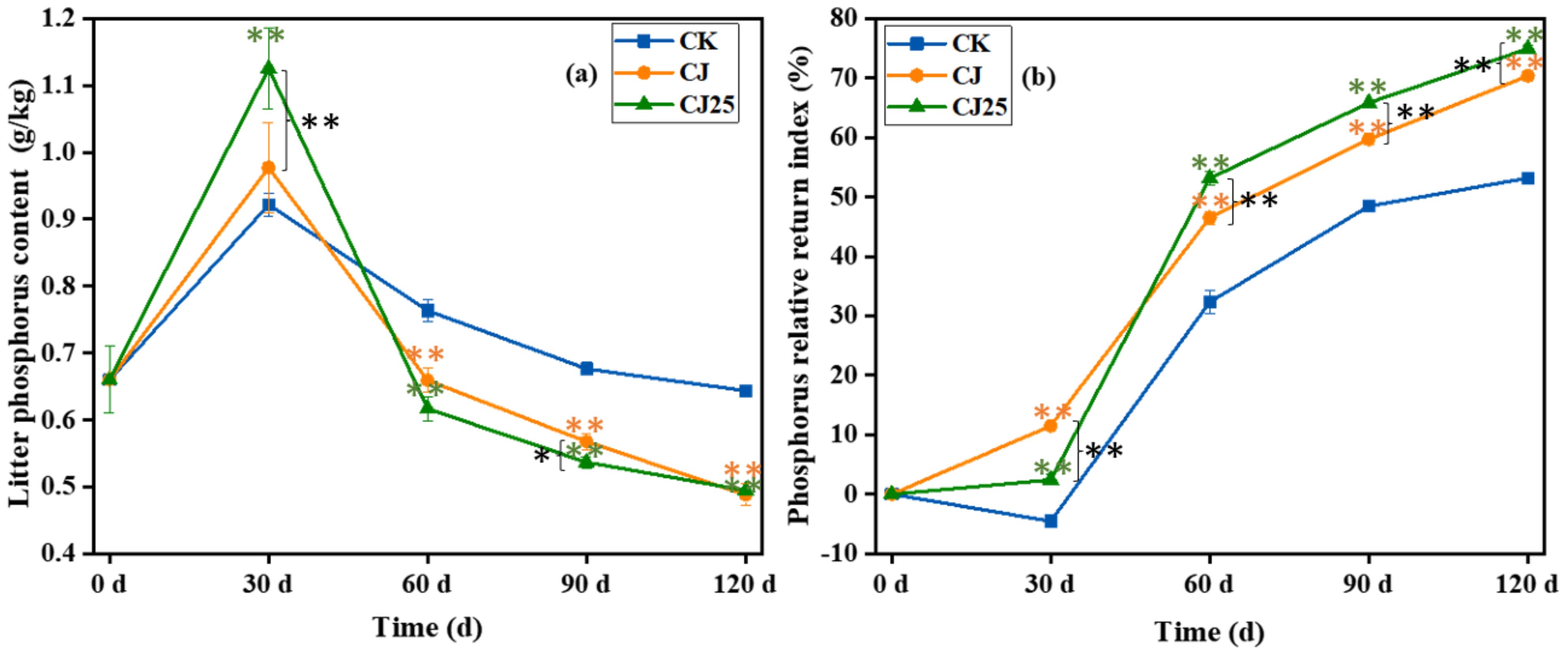 Figure 6. Effects of different treatments during the litter decomposition process: (a) litter total phosphorus content and (b) phosphorus relative return index, both as a function of time. The error bars represent the standard deviations from three biological replicates (litterbags). Data were statistically analyzed using two-way analysis of variance (two-way ANOVA). Significance is indicated with asterisks (*p<0.05, **p<0.01).