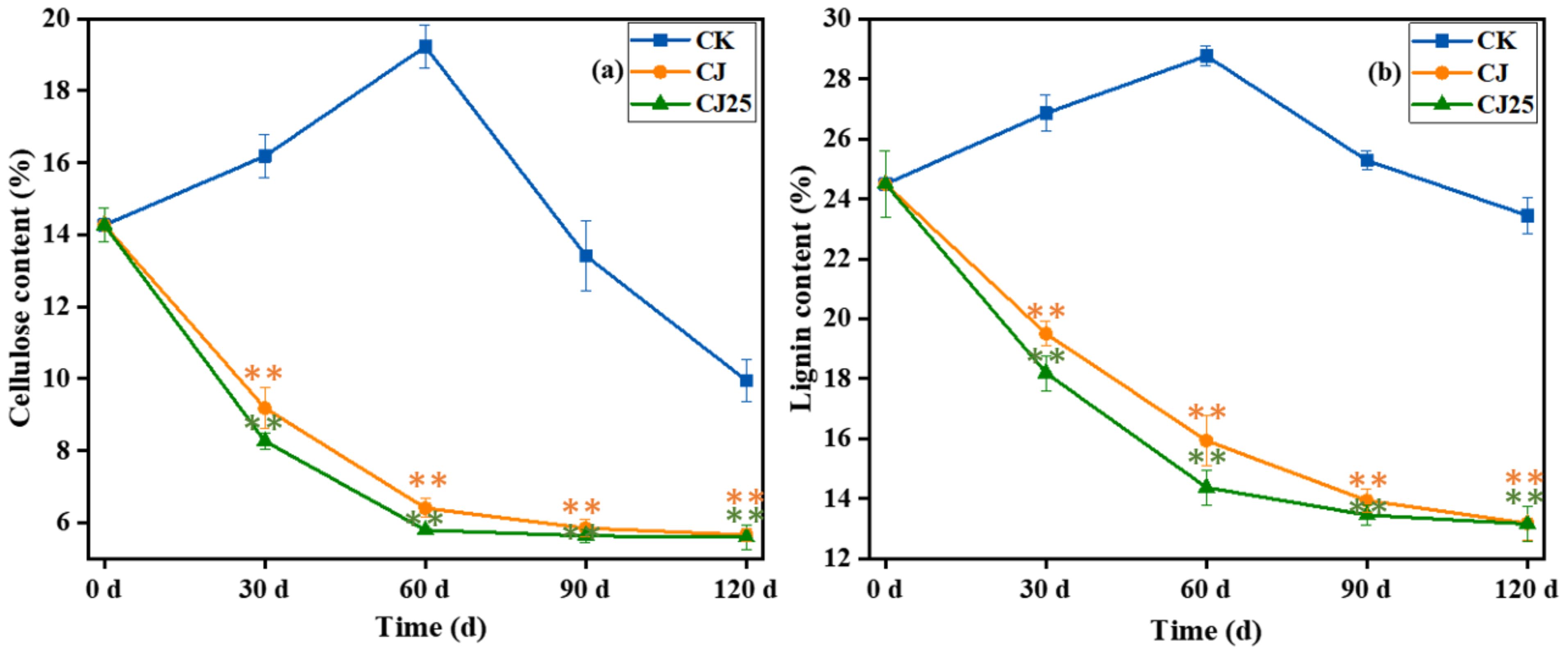 The change in lignin content during litter decomposition is shown in Figure 7b. Its trend is similar to that of cellulose. The lignin content of the CK treatment first increased and then decreased, while the lignin content of the CJ and CJ25 treatments gradually decreased.