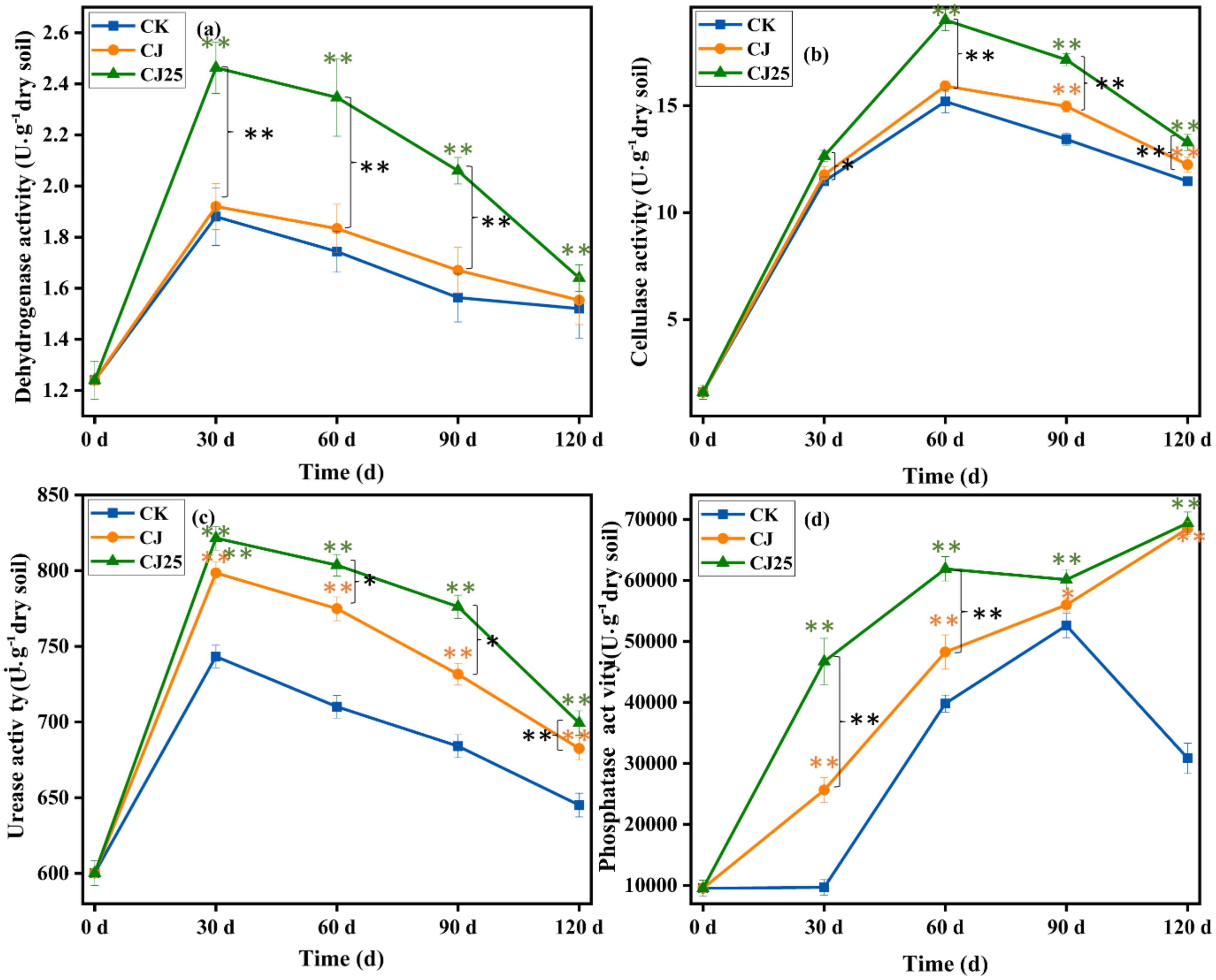 Figure 8 shows the changes in soil dehydrogenase, cellulase, urease, and phosphatase activities under different treatments. The dehydrogenase activity first increased and then decreased. At 30, 60, and 90 days, the dehydrogenase activity of CJ25-treated soil was higher than those of the CJ- and CK-treated soils; at 30 days, it was higher by 31.6% and 38.9%, respectively (p<0.05), while the activity of CJ-treated soil was only slightly higher than that of CK (p>0.05). At 30 days, the dehydrogenase activity reached its maximum values for all three treatments: 1.8, 1.9, and 2.5 U/g for CK, CJ, and CJ25, respectively. However, at 120 days, there were no significant differences in dehydrogenase activity among the three treatments (p>0.05).
