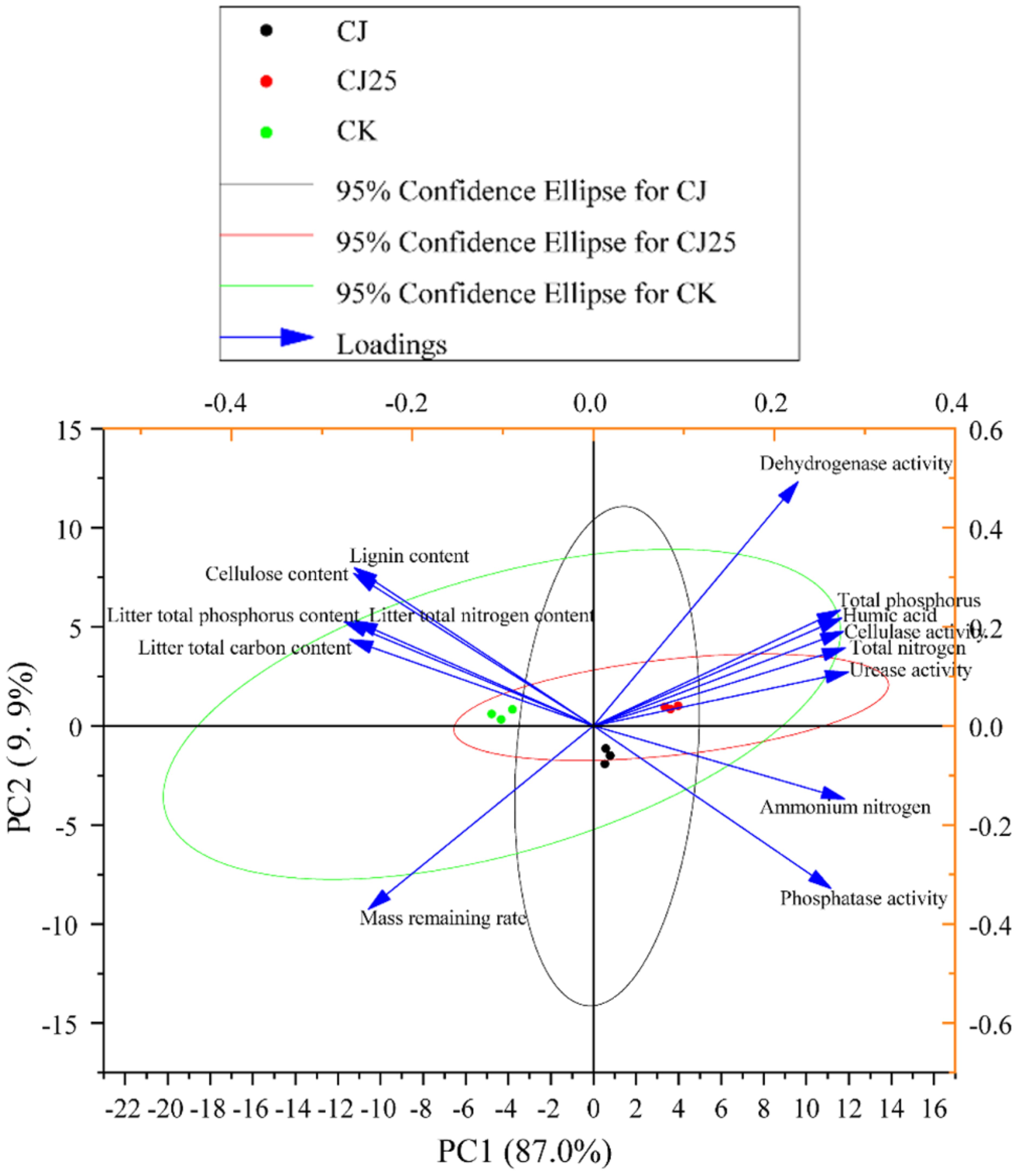 Figure 9. Principal component analysis (PCA) analysis results of the mass residue rate of litter, litter composition content, soil physicochemical properties, and enzyme activities after 120 days of treatment with GO synergistic bacterial agent. The image was drawn using the Origin 2022 software. Arrows representee different environmental factors. Small circles representee groups.