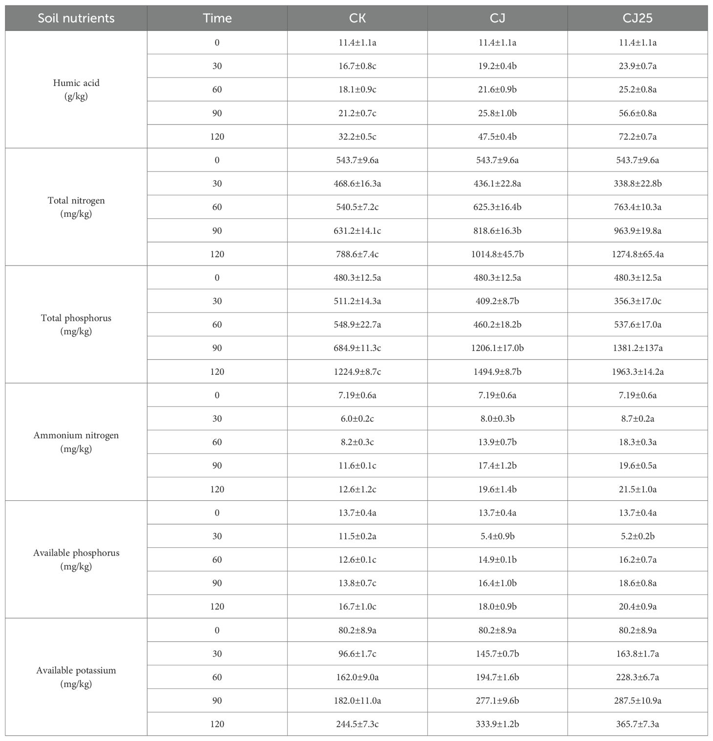 Nutrients are released during the decomposition of litter, part of which is absorbed and utilized by microorganisms and animals, with the other part returned to the soil to be utilized by plants (42). This promotes the recovery of soil fertility, is an important link in the nutrient cycle of the ecosystem, and is also an important manifestation of ecosystem function (43). Table 2 shows the changes in soil nutrient content during litter decomposition. As seen in the table, soil humic acid content gradually increased over time. On the 30th, 60th, 90th, and 120th days of decomposition, the soil humic acid content of the CJ25 treatment was significantly higher than those of CJ and CK (p < 0.05). By the 120th day, the humic acid content was 72.2 g/kg, higher than that of CJ and CK by 52.0% and 124.2%, respectively (p<0.05). The soil total nitrogen content (STNC) showed a trend of first decreasing and then increasing. At 30 days, the STNC of CJ25 was the lowest. At 60, 90, and 120 days, the STNC of CJ25 was the highest (p<0.05). At 120 days, STNC under CJ25 was higher than CJ and CK by 25.6% and 61.7%, respectively (p < 0.05).