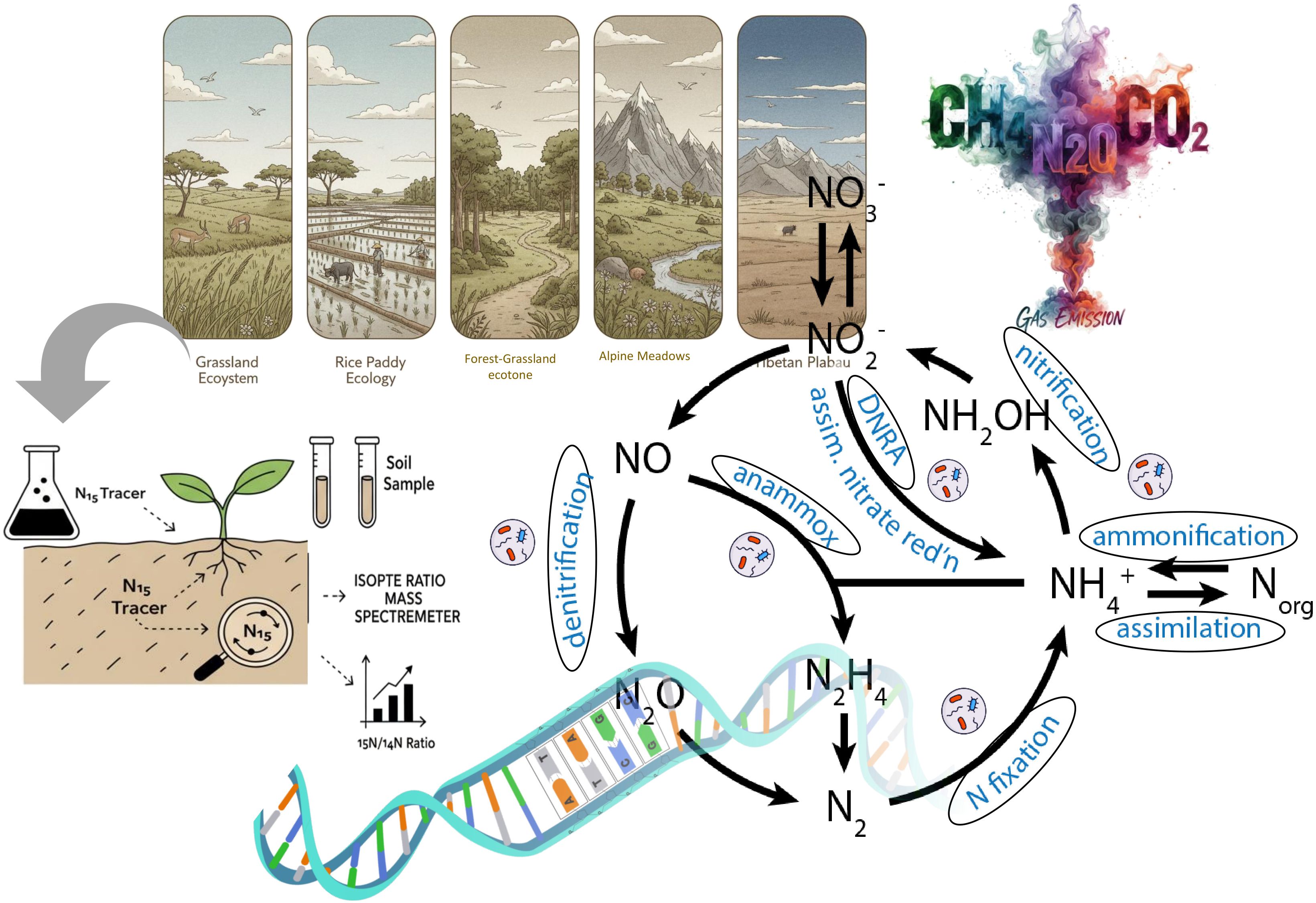 Figure 1. Diagram illustrating nitrogen cycling across different ecosystems: grassland, rice paddy, forest-grassland ecotone, alpine meadows, and Tibetan plateau. Processes include nitrification, denitrification, ammonification, and nitrogen fixation. It involves tracing nitrogen-15 isotopes in soil samples to measure isotope ratios. Gas emissions are represented as CH4, N2O, and CO2. The cycle connects soil, plant uptake, and emissions, emphasizing nitrogen transformations and emissions.