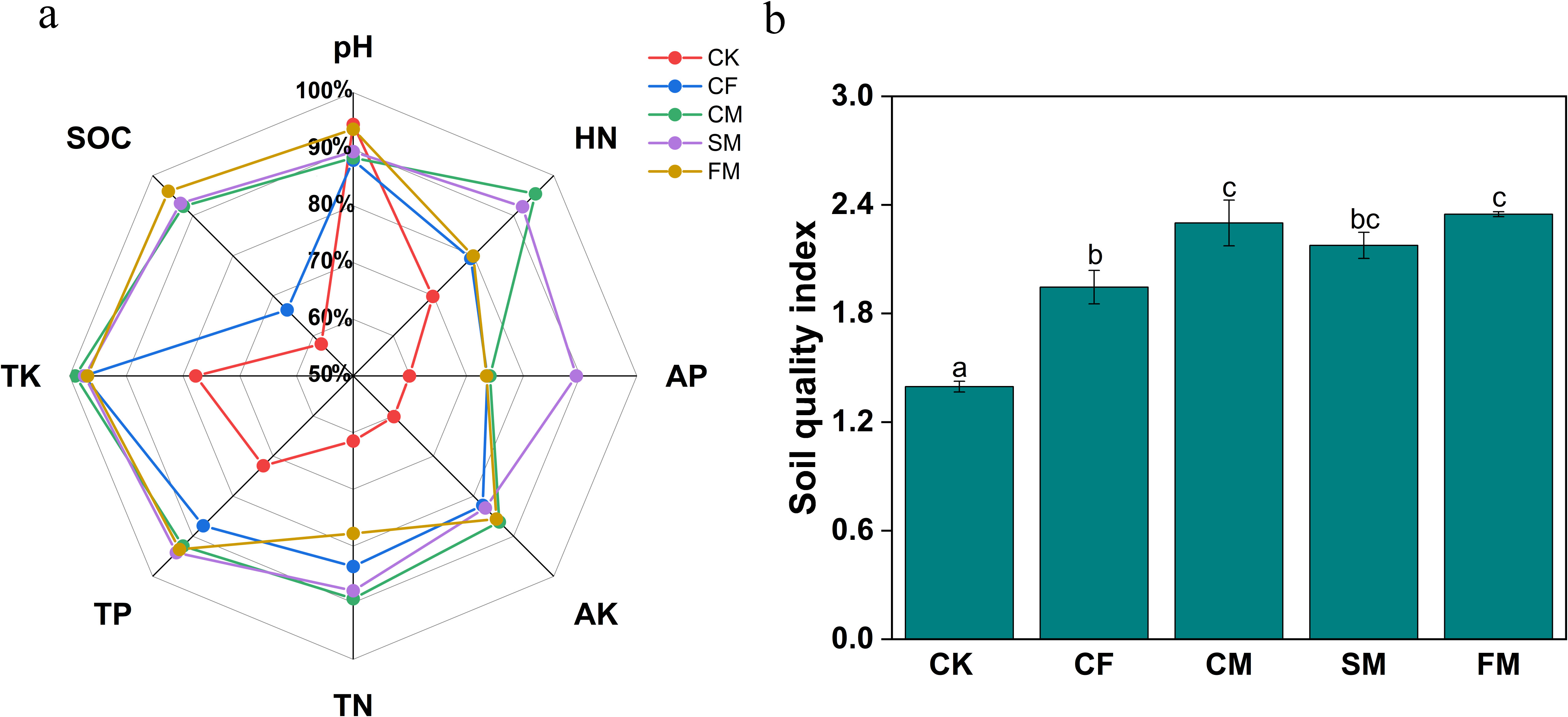 Fertilizers significantly increased the soil concentrations of HN, AP, AK, TN, TP, TK, and SOC (p < 0.05; Supporting Information: Supplementary Figure S1). Among all the fertilization treatments, CM and SM treatments exhibited relatively higher soil concentrations of HN, AP, AK, TN, TP, TK, and SOC. Moreover, organic fertilizers significantly increased SOC concentration (p < 0.05). In the tobacco fields, HN, AP, AK, TN, TP, TK, and SOC in fertilizer treatments are 13.6%–36.7%, 22.7%–49.1%, 36.8%–43.7%, 26.5%–45.2%, 20.7%–30.0%, 24.5%–27.3%, and 14.7%–65.7% (Figure 1a). The soil quality index (SQI) for CM, SM, and FM treatments was higher than that of the CF treatment by 18.2%, 11.9%, and 20.7%, respectively. (p < 0.05; Figure 1b). Notably, the increases in the SQI for the CM and SM treatments were statistically significant (p < 0.05). The application of organic fertilizers can enhance the SQI, with manure, straw, and farmyard compost of manure exhibiting higher SQI.