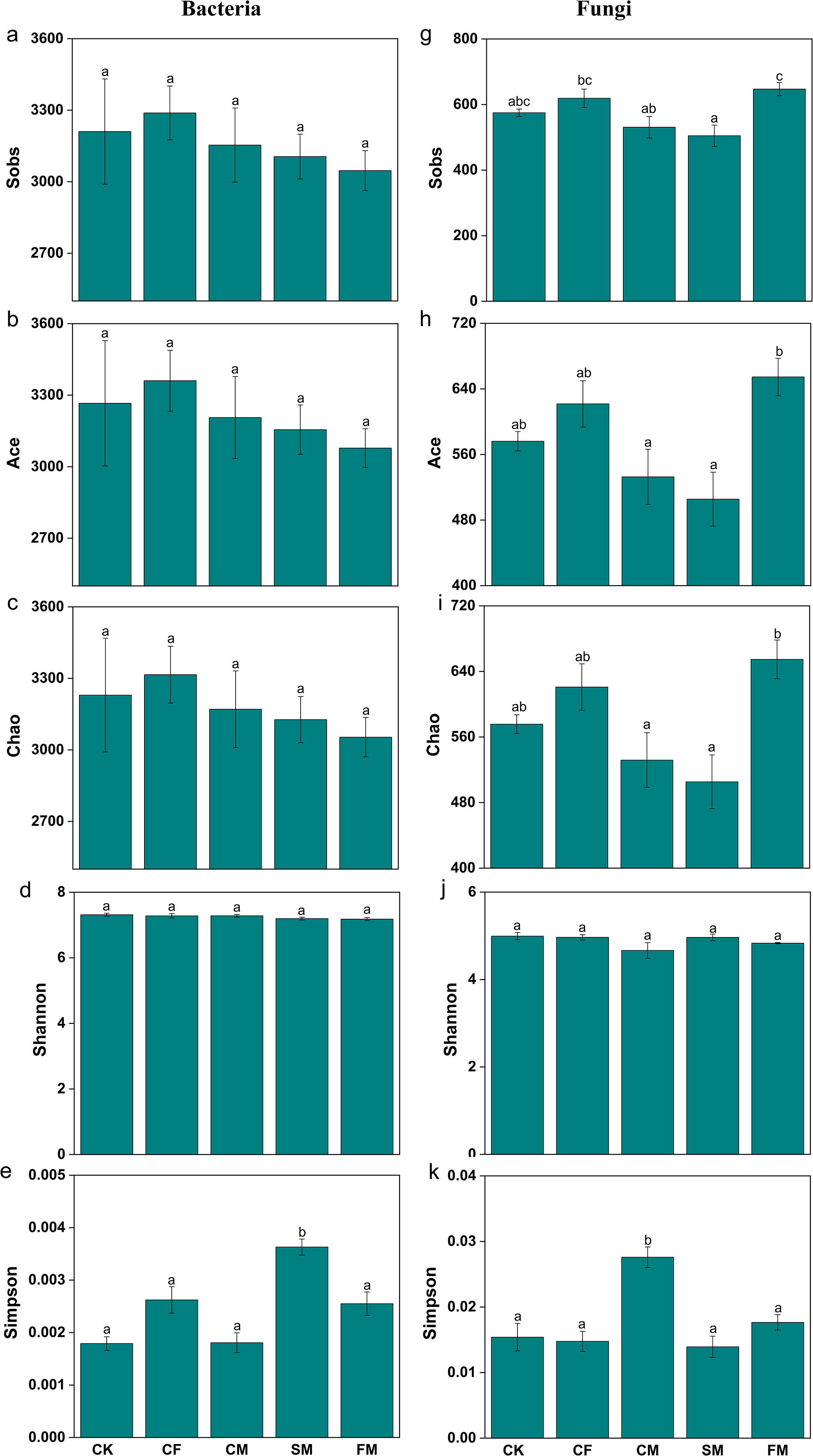 Figure 3. The α diversity index of bacteria (a–e) and fungi (g–k) at ASV level. Different lowercase letters indicate significant differences at the p < 0.05 level.